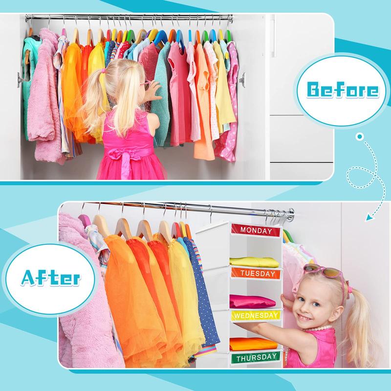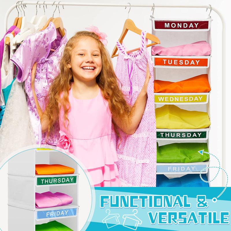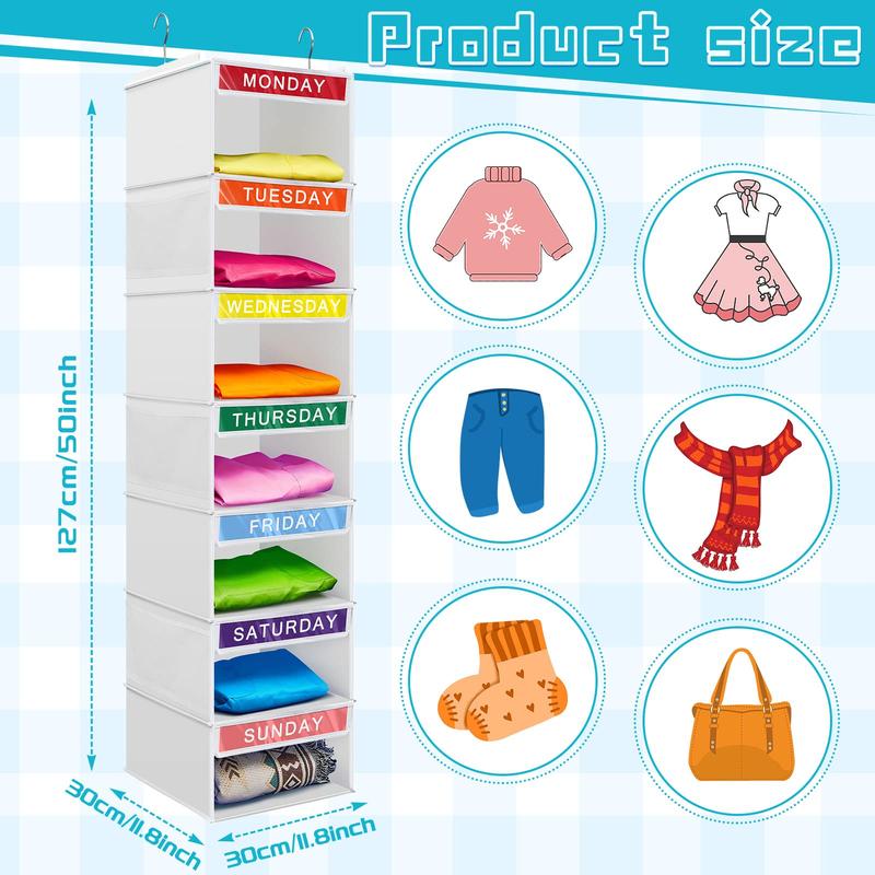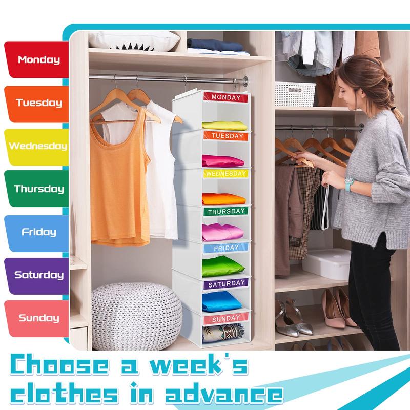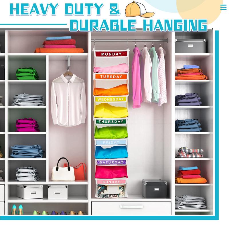 Funny Design: the hanging clothes storage organizer mainly comes in white and has colorful side pockets, funny and lively, it adopts a weekly tabs design, so that you can prepare the clothes or other things you need according to the day of week, easily assign the outfit schedules from weekday to weekend for youror for yourself, practical for you to use