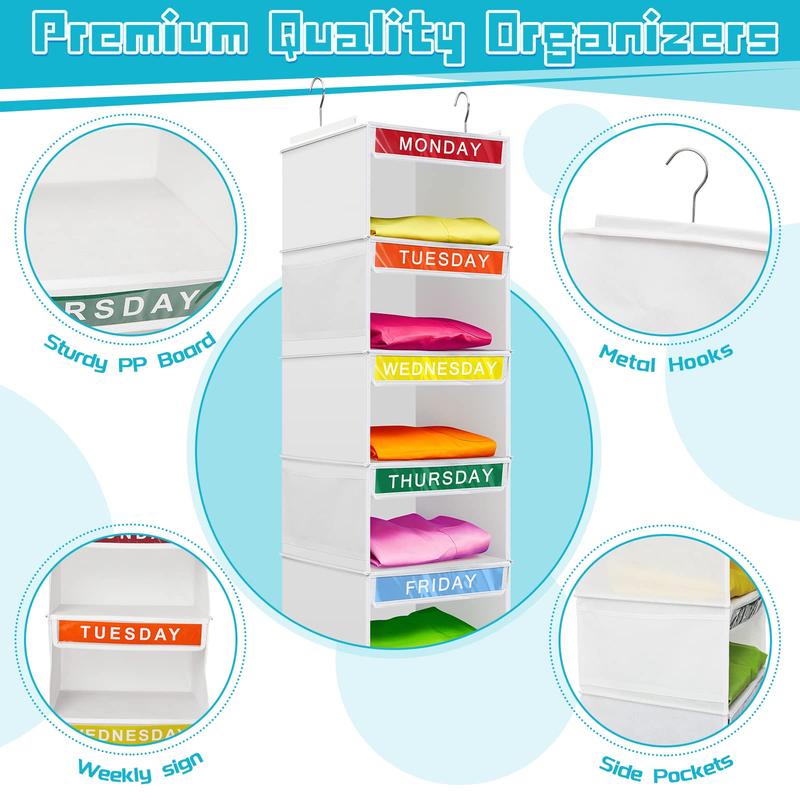 Tidy up Your Closet: you will get 2 pieces of weekly clothes organizers, which have 3 side pockets that come in different colors, lively and lovely, enough to meet your organizing needs; The day labels are able to be rearranged