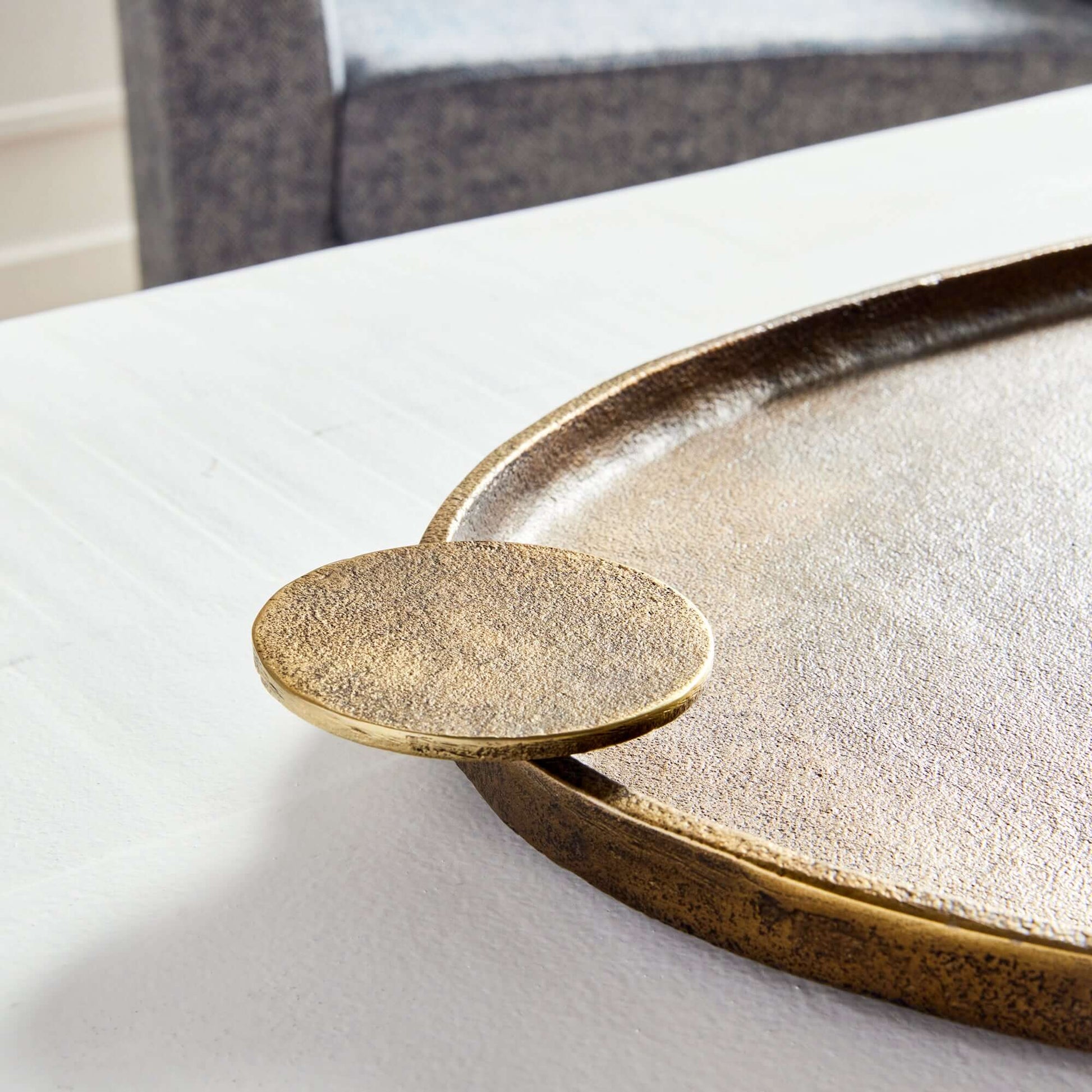 This antique brass decorative tray with handles evokes the quiet elegance of a bygone era—one where hospitality was an art and beauty was found in the details. Crafted from solid cast aluminum and finished in a deep, burnished antique brass, this tray whispers of old-world craftsmanship and timeless design. The oval shape, slightly curved edges, and smooth yet textural finish create a rich, tactile experience reminiscent of vintage heirlooms handed down through generations. Two rounded, sculptural handles—delightfully oversized—add an unexpected, artistic flair, making it a true conversation piece.