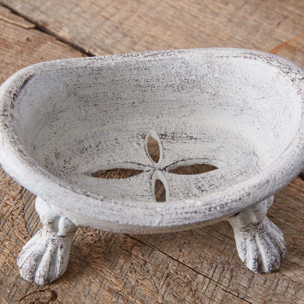 This rustic clawfoot tub soap dish is perfect for bringing a touch of old world charm into your bathroom. Designed with antique inspiration, the distressed white finish adds high-key character to the soap dish, making it a wonderful house warming gift that will fit into just about anyone's bathroom setup. Made of cast iron, the clawfoot soap dish is sturdy and large enough to hold your favorite soap bars, or smaller decorative soaps. Drainage holes ensure that water doesn't accumulate in the soap dish, and also makes for easy cleaning.