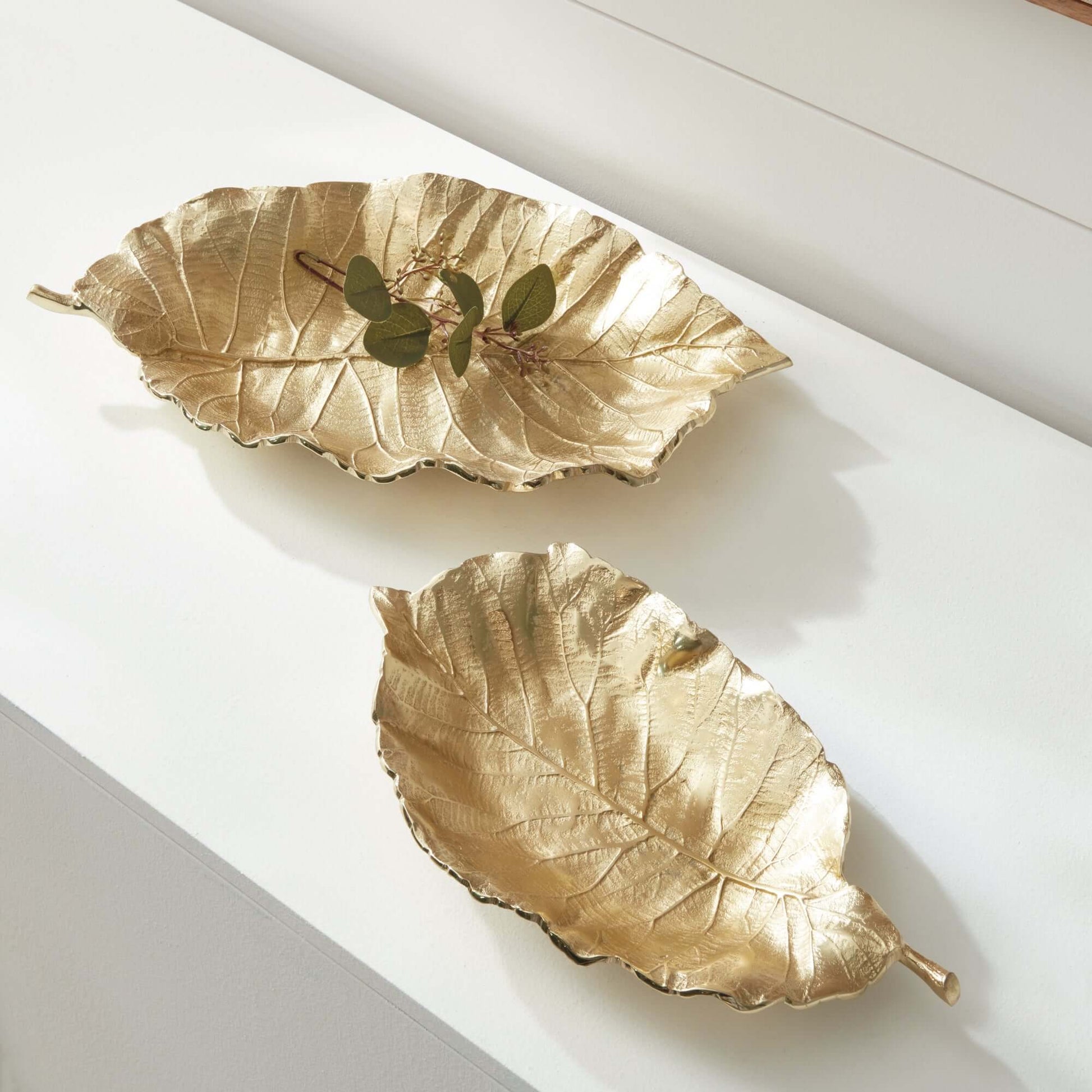 The luminous sheen and sculptural shape make it a true showstopper—equally suited for resting atop a coffee table layered with books and candlelight, or catching keys and jewelry on a hallway console or vanity. The antique gold leaf shaped accent tray evokes the atmosphere of a gilded age, when decorative objects were thoughtfully crafted and full of character.