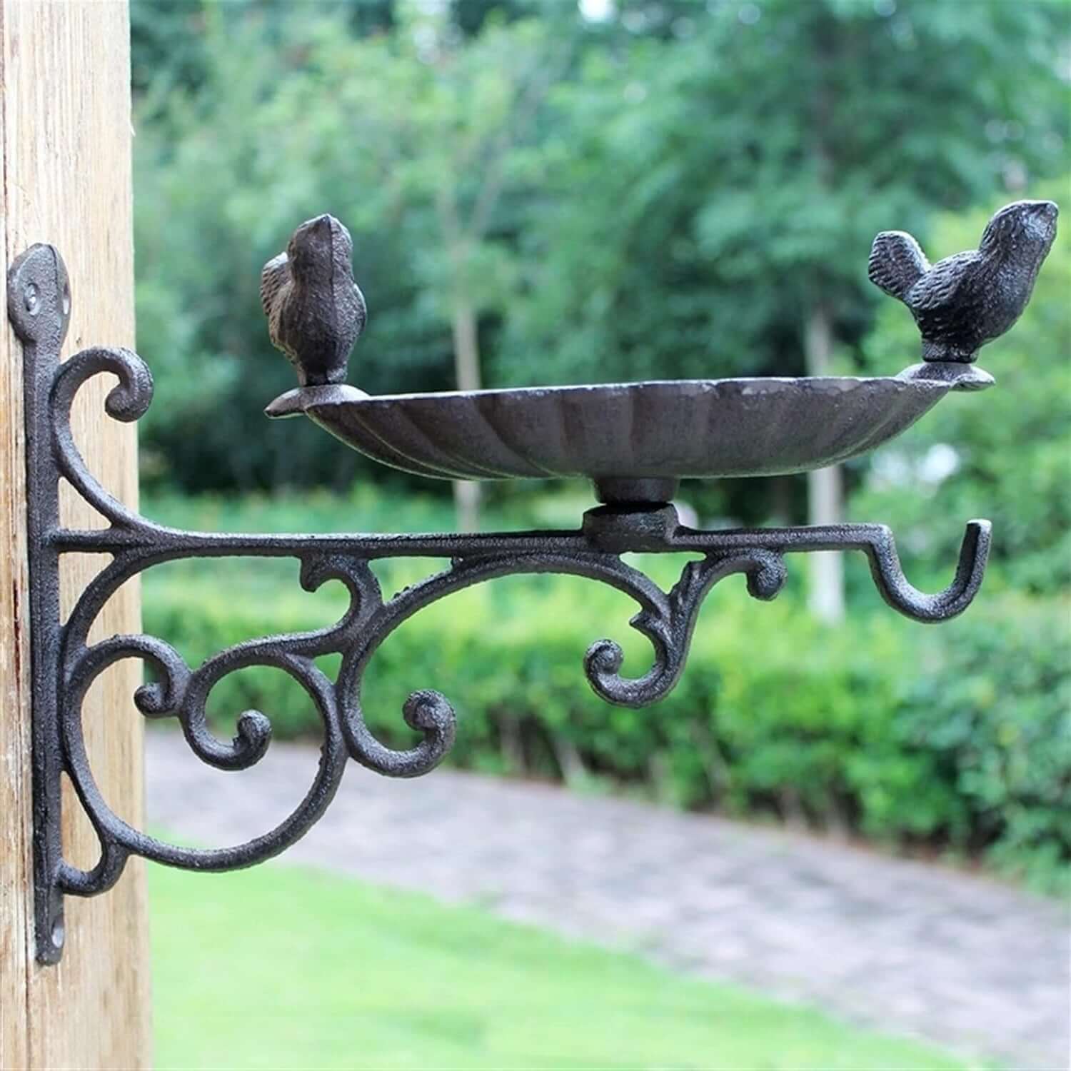The curved bracket features elegant Victorian-inspired scrolls, adding an old-world artistry reminiscent of hand-forged ironwork from the late 19th century. Resting above is a shallow basin with fluted edges, perfect for serving seeds or water. Flanking the bowl are two finely detailed cast iron birds, eternally poised as if caught mid-chirp, evoking the poetic stillness of early country mornings.