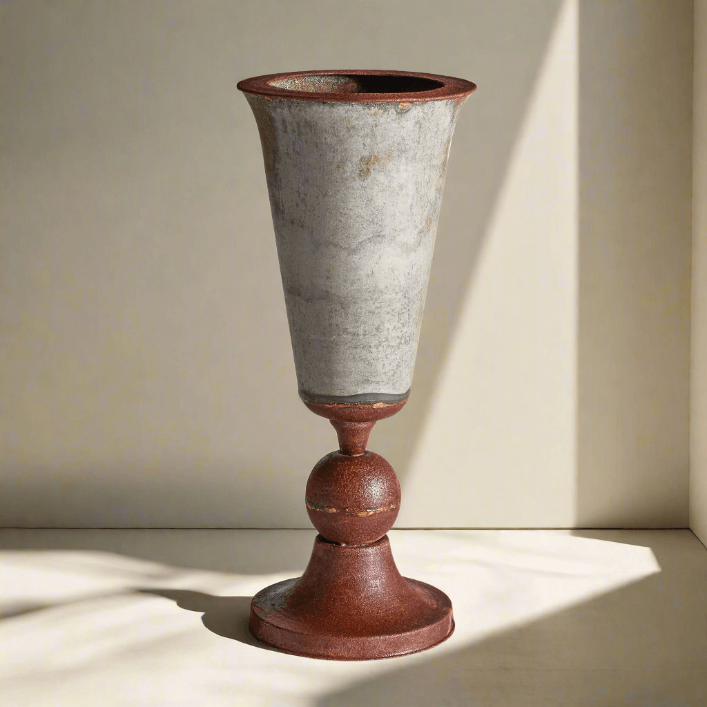 Elevate your space with the timeless charm of this antique style weathered metal urn planter, a piece that feels as though it were uncovered in the garden of a forgotten chateau. With its elegantly tapered cone silhouette and richly textured, aged metal surface, this urn whispers of a slower time—when patina was earned, and every object held a story. The weathered gray bowl contrasts beautifully against the warm, rust-kissed base, giving the impression of a piece shaped by decades of sun, soil, and memory.