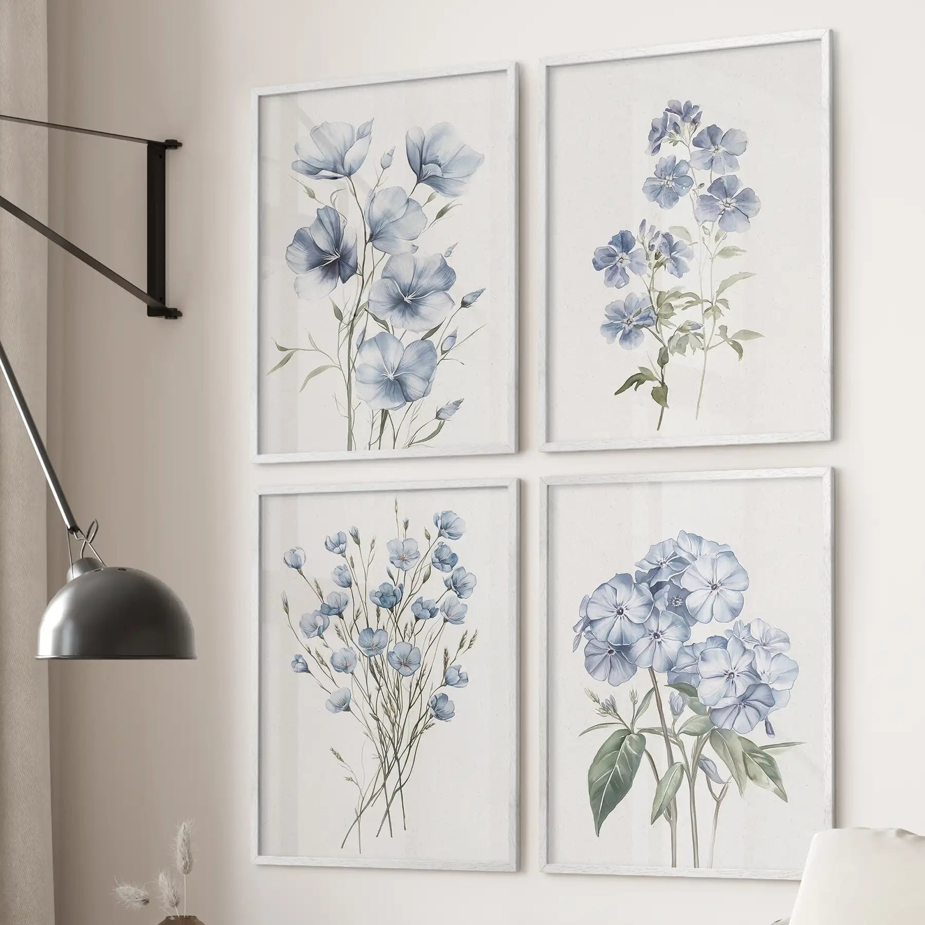 Set of 4 blue flower prints featuring flax and phlox in soft watercolor style. Perfect for bedroom, living room, or office decor. Elegant minimalist wall art to bring calm and nature into your space. Printed on premium paper for physical delivery.