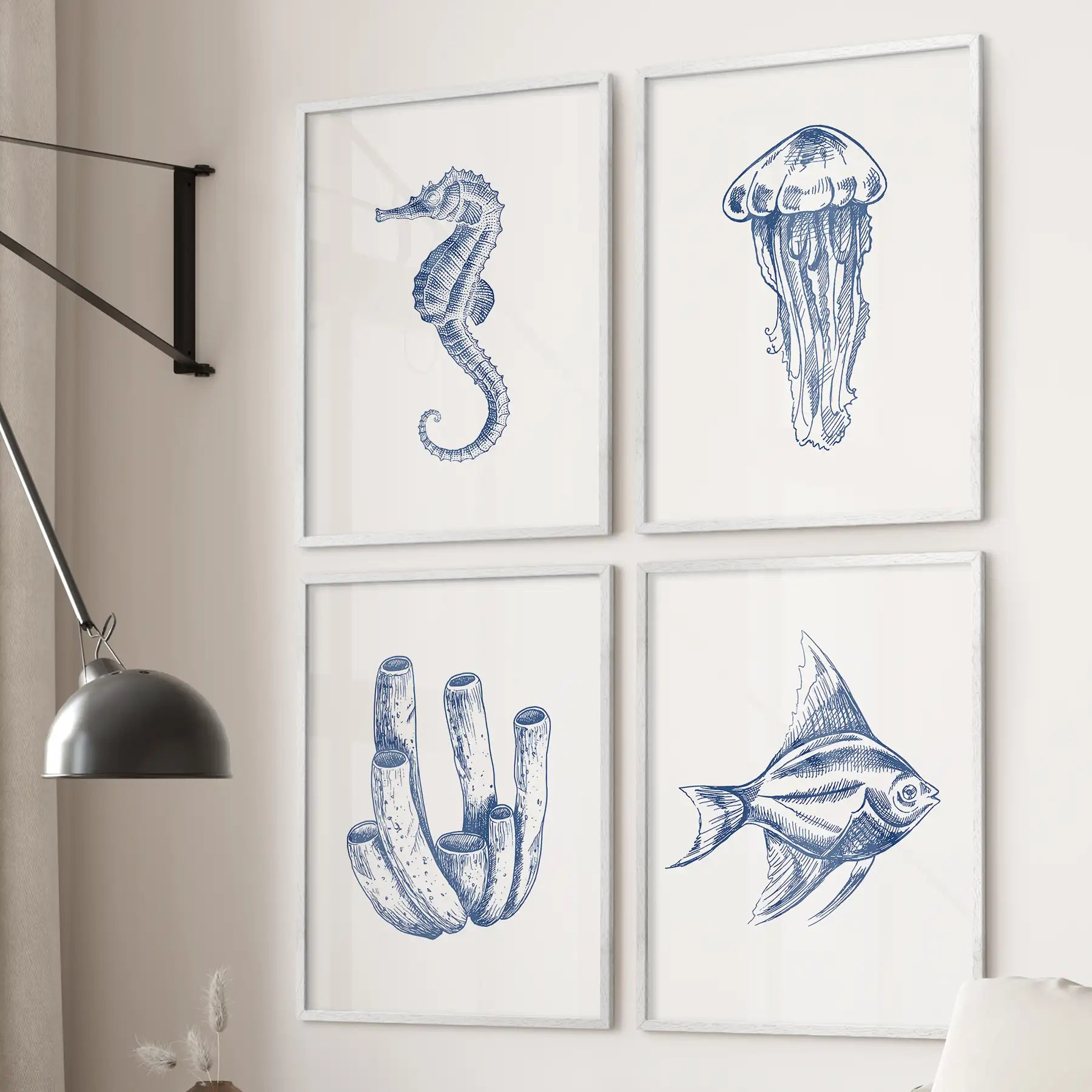 Blue Coastal Artwork. Set of 4 Posters. Jellyfish, Fish Print
