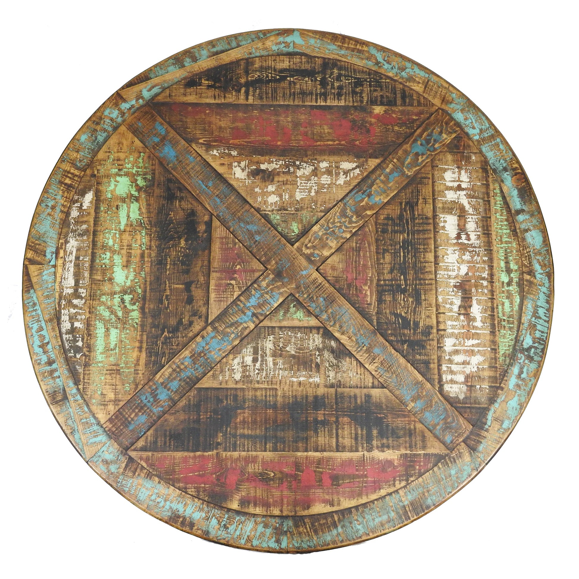 Gather around the Cabana Round Rustic Dining Table for memorable meals and moments of connection. Crafted from solid pine wood, this 52-inch wide table features a captivating multicolor finish enriched by a dark brown wax, accentuating its natural beauty and durability.