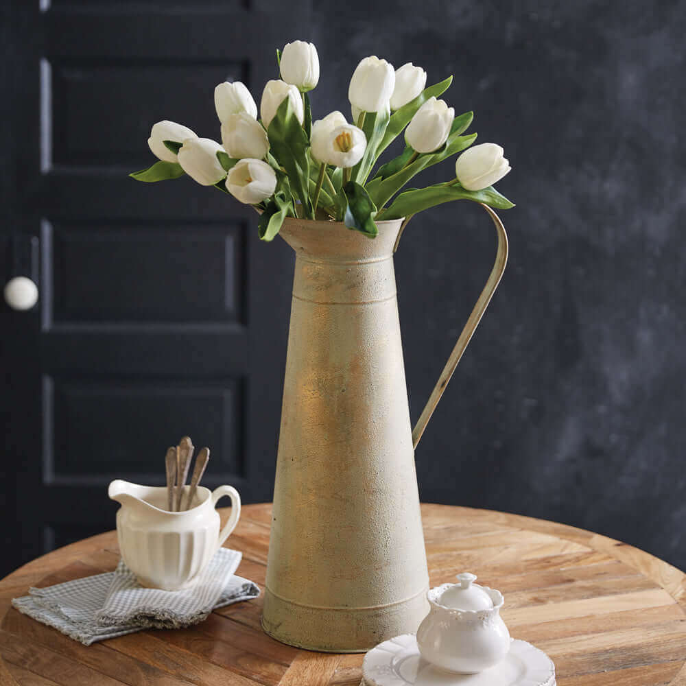 Made from durable metal, the Gilded Farmhouse Pitcher Vase is built to last, making it a versatile and enduring piece for any room in your home. While it adds a beautiful decorative element, the vase is not food safe and not guaranteed to be watertight. Therefore, it’s best used with dried floral arrangements or as a standalone decor piece rather than for fresh flowers or liquids.