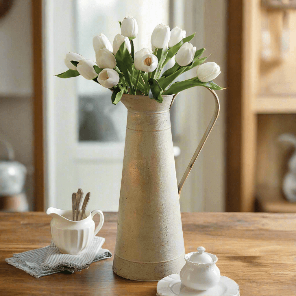 The defining feature of this pitcher vase is its elegant shape, which evokes traditional farmhouse design. Its long, slender neck and elegant handle give it a sleek and refined look, reminiscent of old-fashioned pitchers used in rural homes. The addition of a gilded touch elevates the design, striking a balance between rustic charm and modern glamour. This combination of weathered textures and metallic accents creates a look that’s both understated and luxurious, ideal for adding character to your decor.