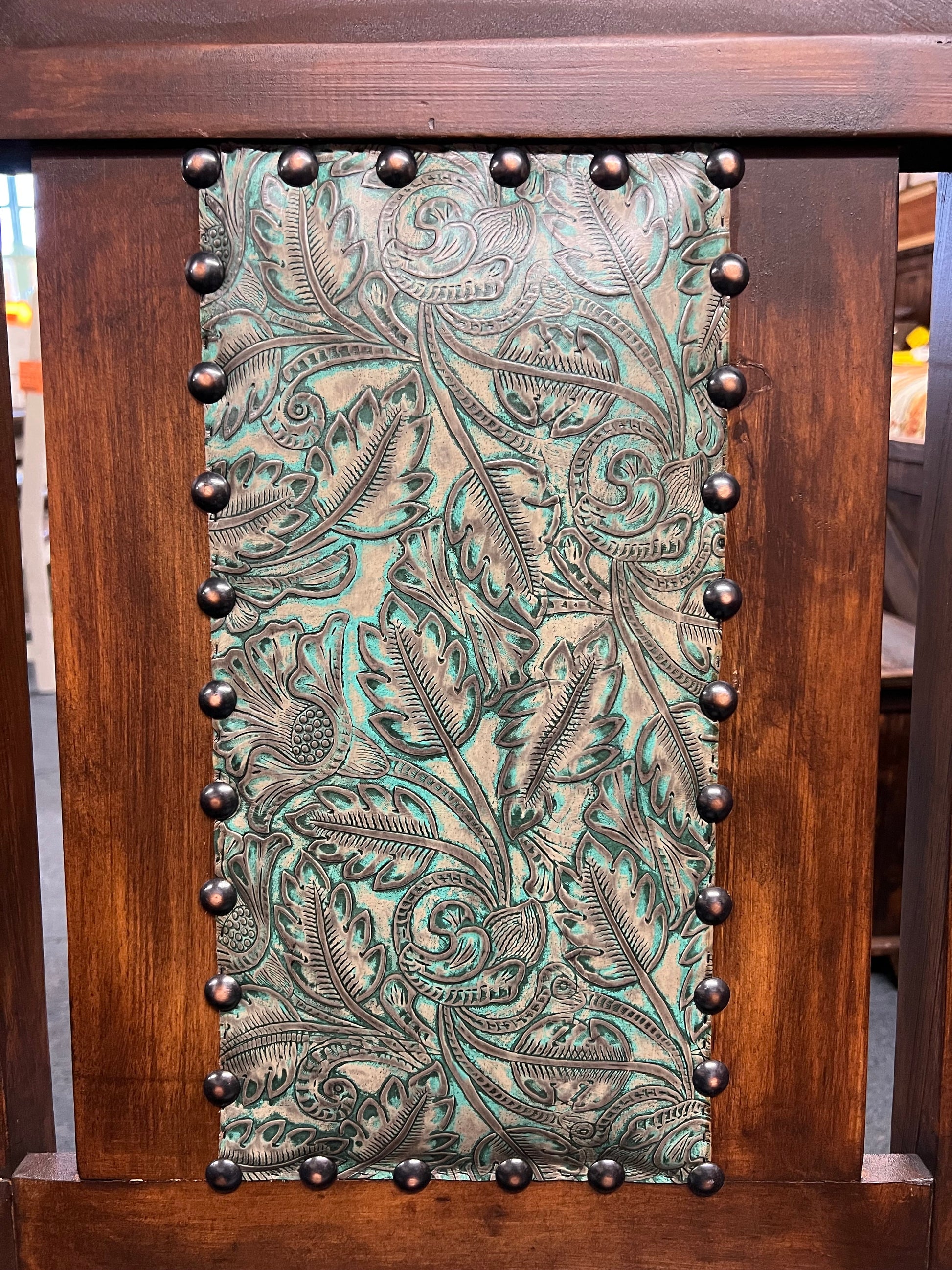 The Gran Hacienda Chair with Tooled Leather features a beautifully upholstered leather seat and a light green Tooled Leather back, providing both style and durability. The leather adds a touch of classic refinement while ensuring long-lasting wear, making it an excellent choice for both everyday use and special occasions.