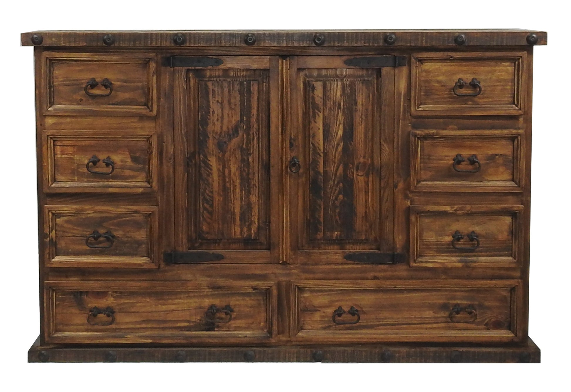 Adorned with rustic details including rusted pulls, hinges, and decorative conchos adorning the top and bottom edges, this dresser effortlessly blends southwestern and western influences, making it an ideal choice for those seeking distinctive furniture with character.
