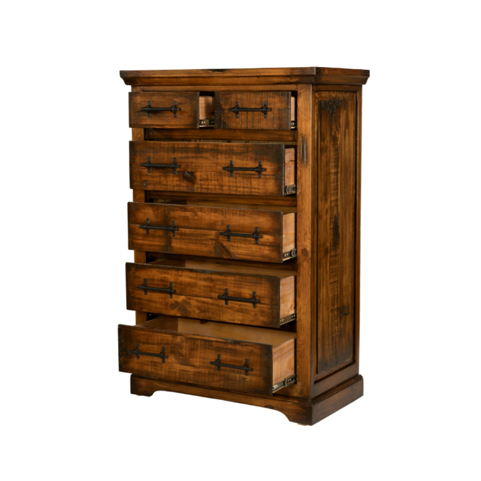 Crafted with meticulous attention to detail, the Lubbock Tall Chest of Drawers Dresser is finished in a rich Oldie Toasted color that enhances its natural wood grain and rustic appeal. Each drawer is equipped with metal pulls, ensuring smooth operation and complementing its rustic charm.