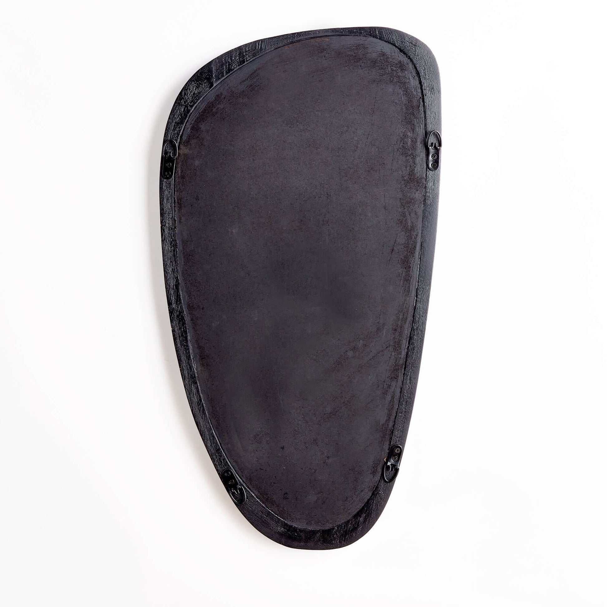 Crafted from solid wood with a subtle, visible grain beneath its matte black finish, the frame embraces natural texture while maintaining a clean, contemporary presence. The irregular, almost pebble-like form softens angular spaces, bringing a sense of movement and fluidity to any wall. It’s a piece that feels curated—like something discovered in a 1960s design showroom or a vintage collector's loft—yet perfectly suited for modern living.