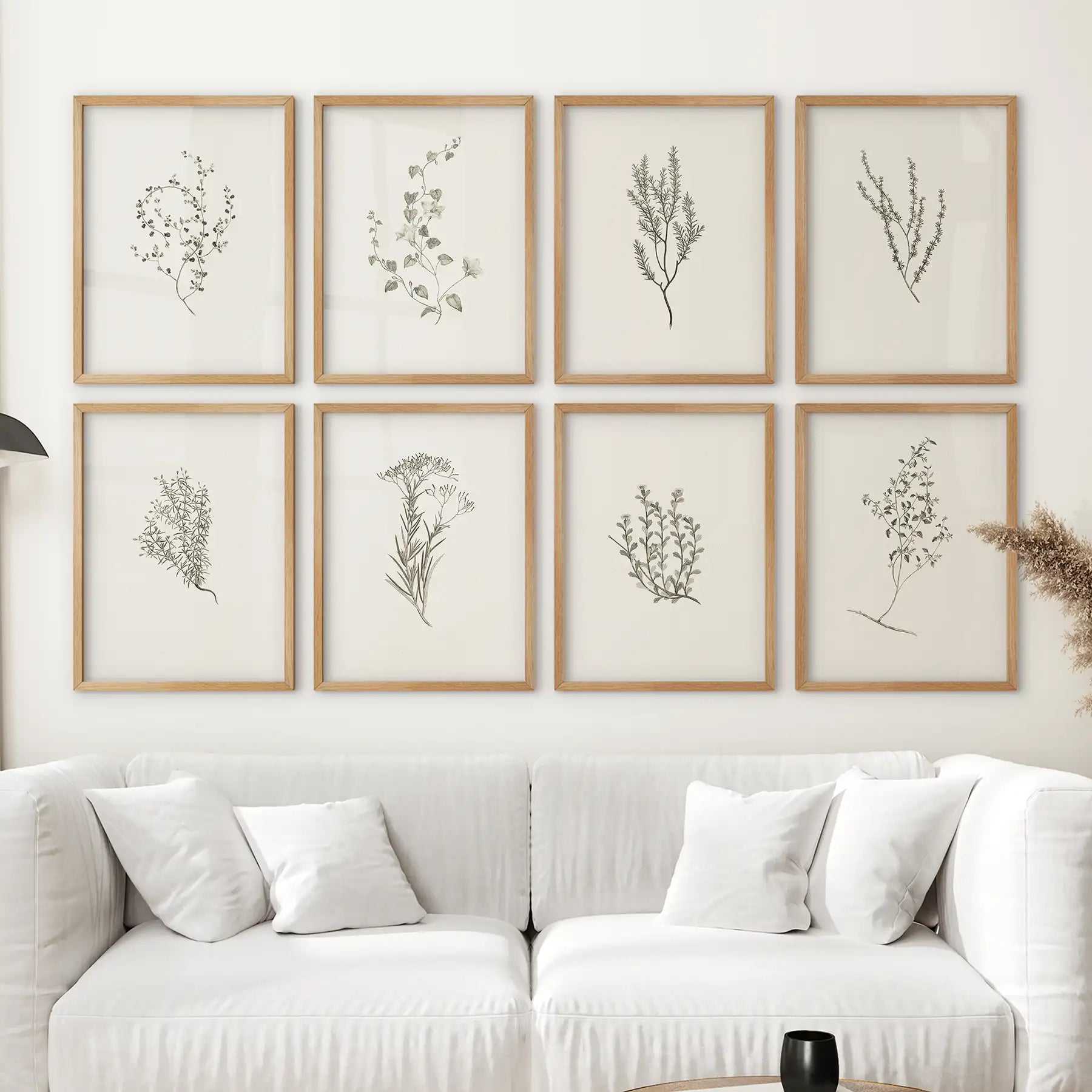 Bring natural calm and organic charm to your space with this set of 8 minimalist botanical prints. Each artwork features a delicate hand drawn sketch of herbs and wildflowers, inspired by vintage botanical illustrations. Perfect for a living room, bedroom, or hallway gallery wall, these timeless prints come in warm wood frames that add a touch of Scandinavian simplicity to any interior.