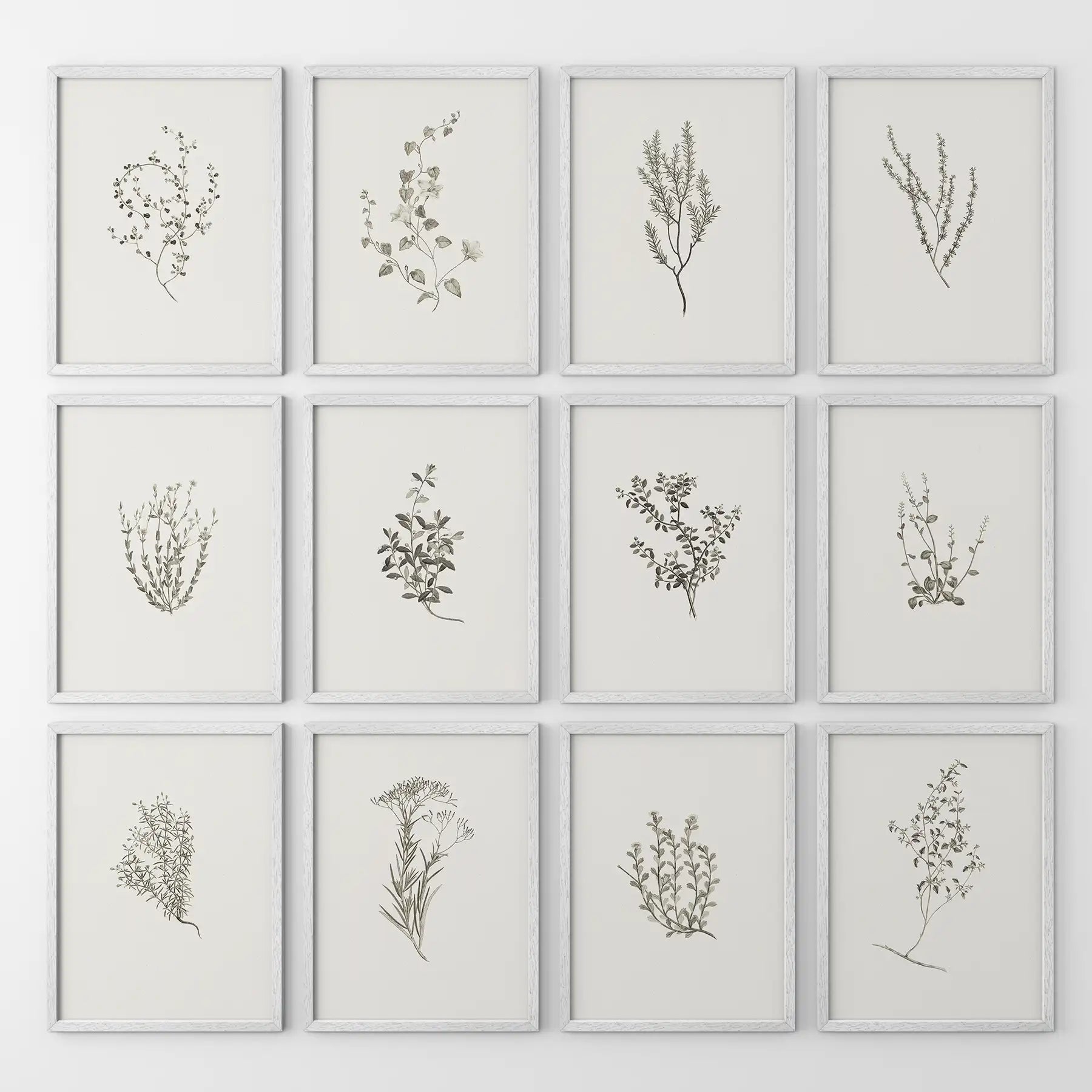 This set of 12 minimalist herb botanical prints features delicate black and white illustrations of aromatic plants. Ideal for kitchens, dining rooms, or modern farmhouse interiors, they bring timeless natural beauty and refined simplicity to any space.