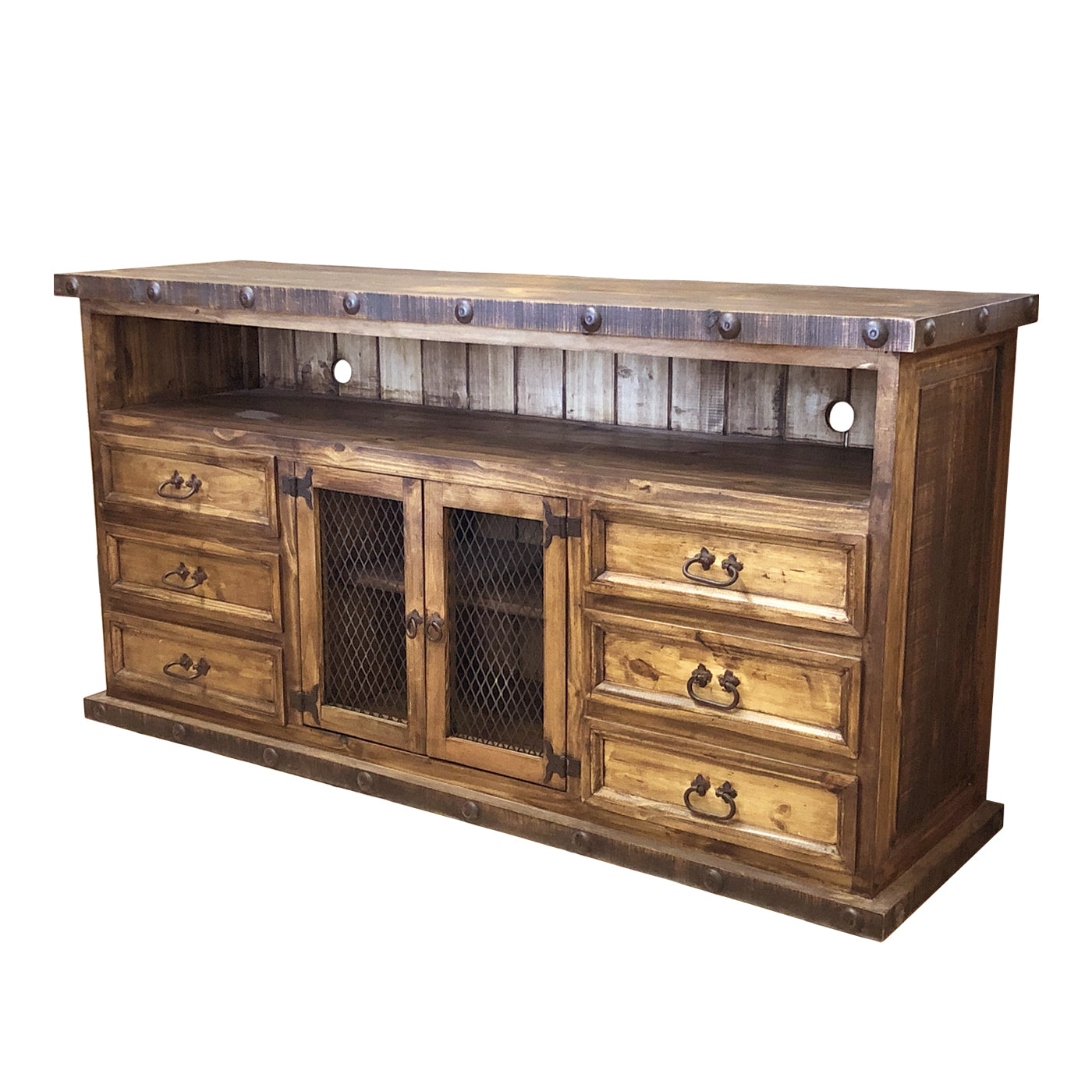 Enhance your entertainment space with the Oasis 70" Rustic TV Stand, a blend of functionality and rustic charm designed to accommodate modern living. This spacious TV stand, measuring 70 inches wide, offers ample storage and display options while exuding southwestern and western-inspired aesthetics.