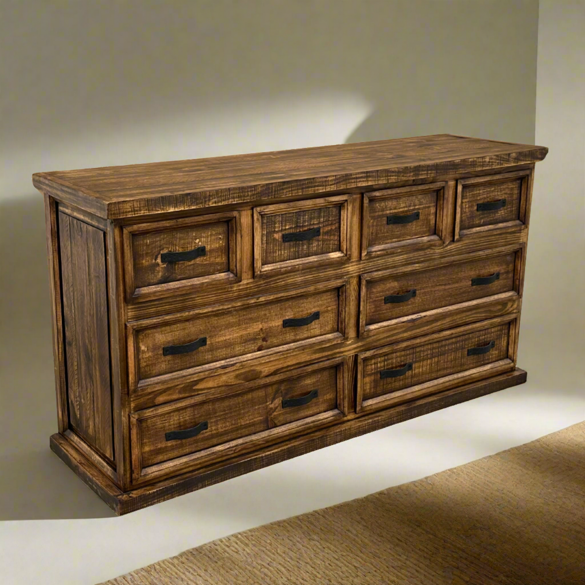 This dresser seamlessly blends southwestern and western influences, making it a versatile addition to various bedroom settings.