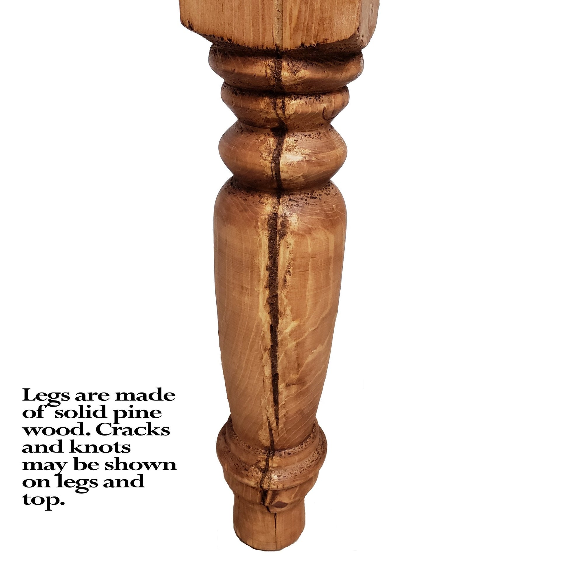 Crafted from solid pine wood, the Oasis Dining Table features elegantly turned legs that add a touch of traditional craftsmanship. The tabletop boasts a rustic, uneven surface that has been meticulously sanded to a smooth finish, highlighting the natural beauty and character of the wood.