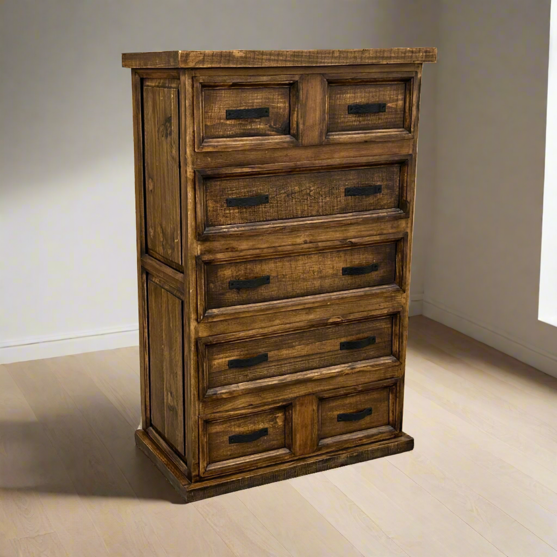 Introducing the Oasis Tall Chest Dresser in Far West color, a robust blend of rustic charm and practicality. Crafted from solid wood and finished in a rich brown tone wax, this dresser boasts durability and timeless appeal.