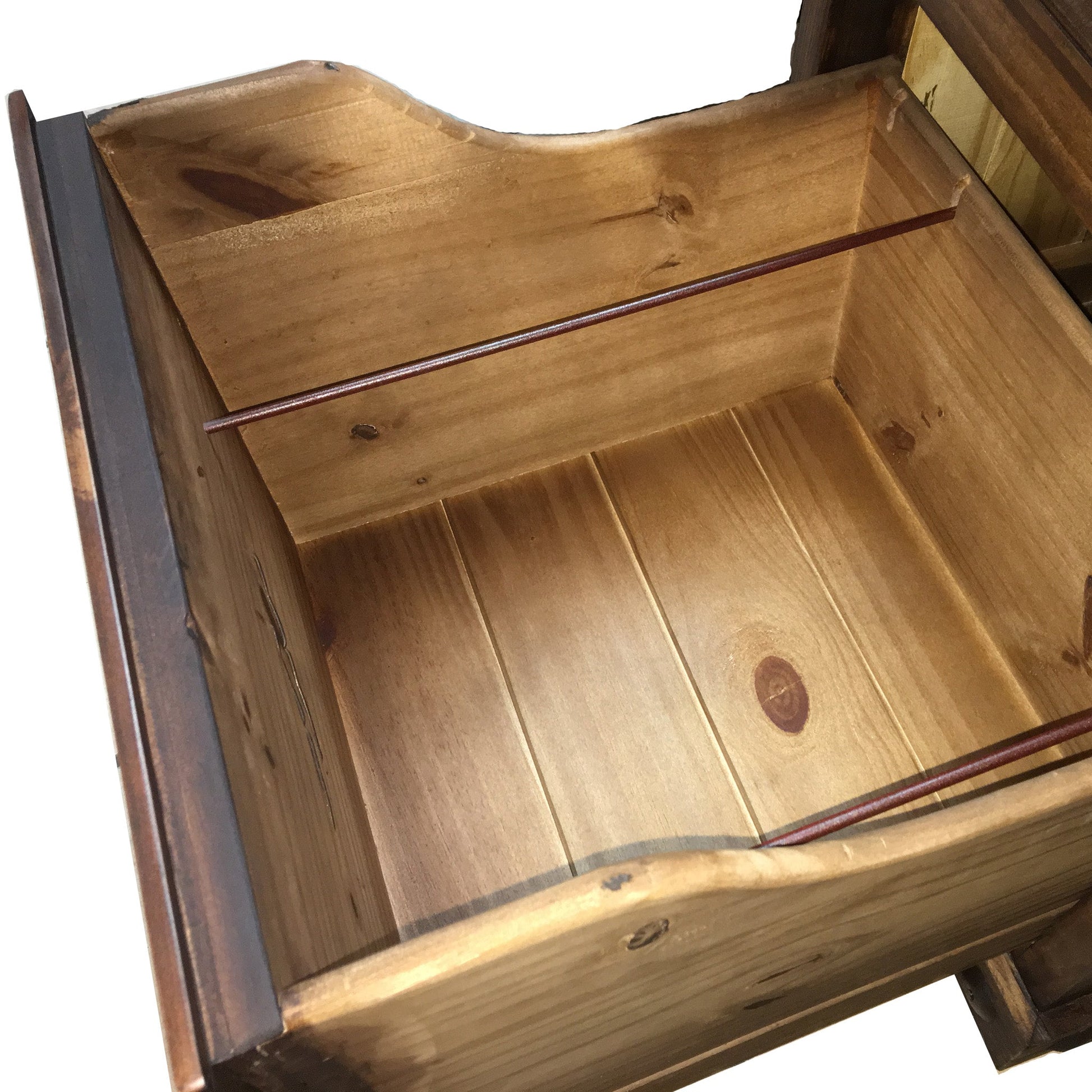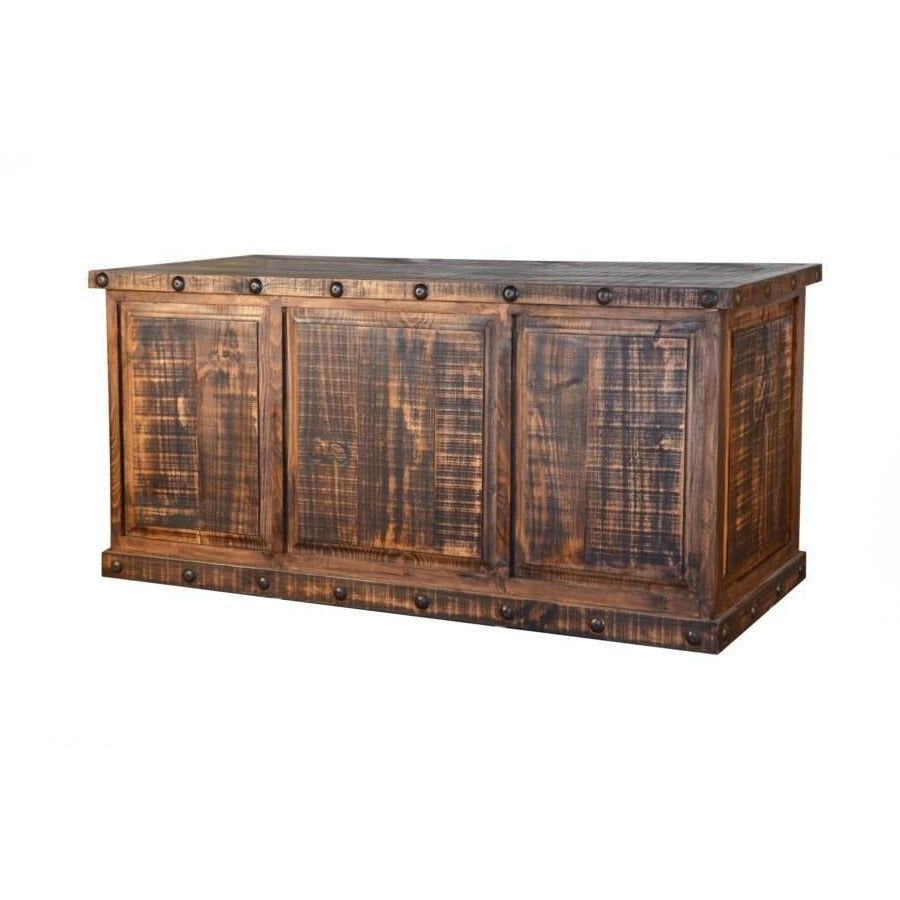 Designed for productivity, it boasts three drawers on one side, and two drawers on the other, including a filing drawer, all accented with rusted pulls and conchos around the top and bottom trim, adding a distinctive Western charm.