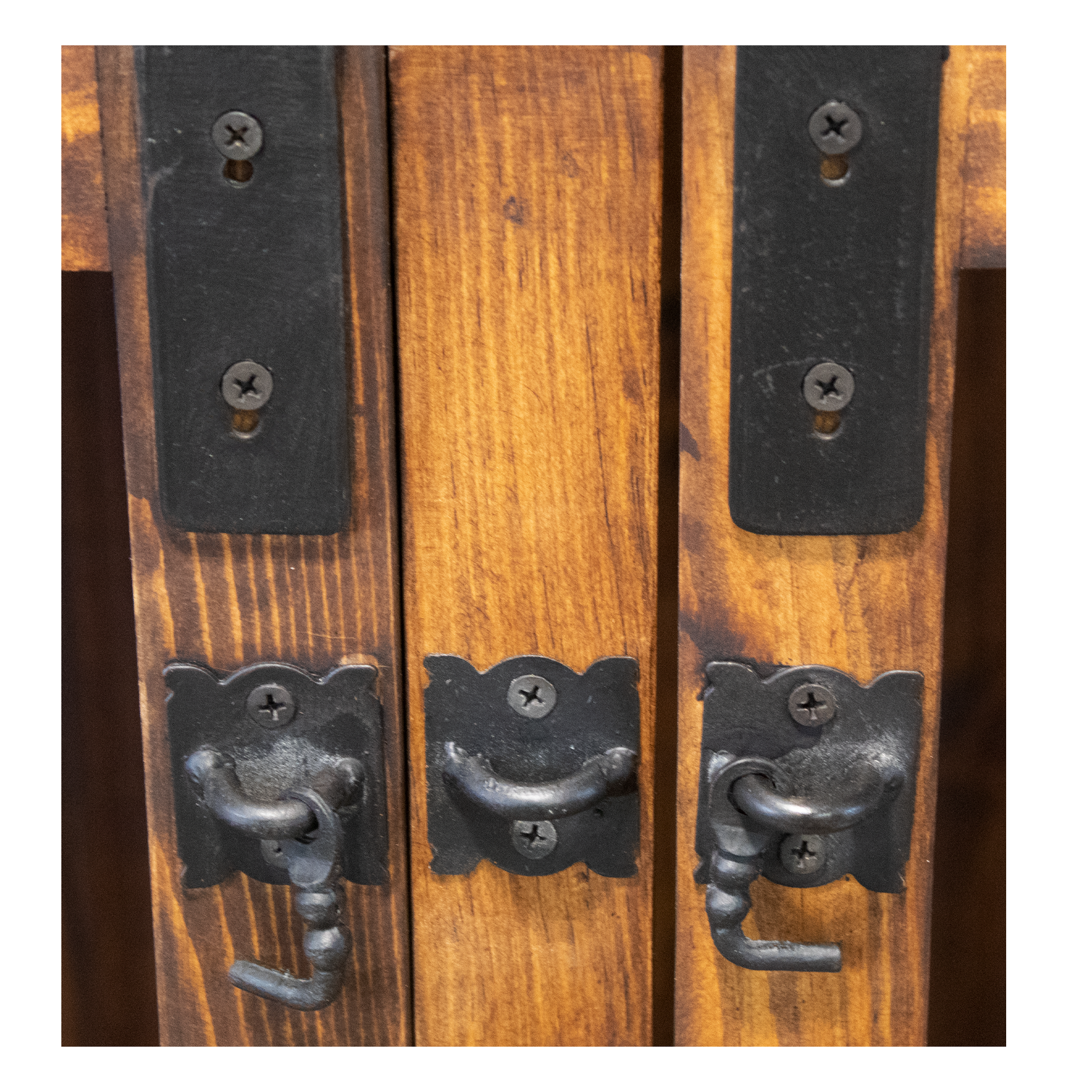 Introducing the Oasis Large Rustic Dog Wood Kennel, a versatile and stylish addition to your home. Crafted from solid wood with metal bars, this piece combines durability with rustic charm, finished in a warm, inviting tone. Adorned with decorative conchos around the top and bottom trim, it adds a touch of southwestern flair to any room.