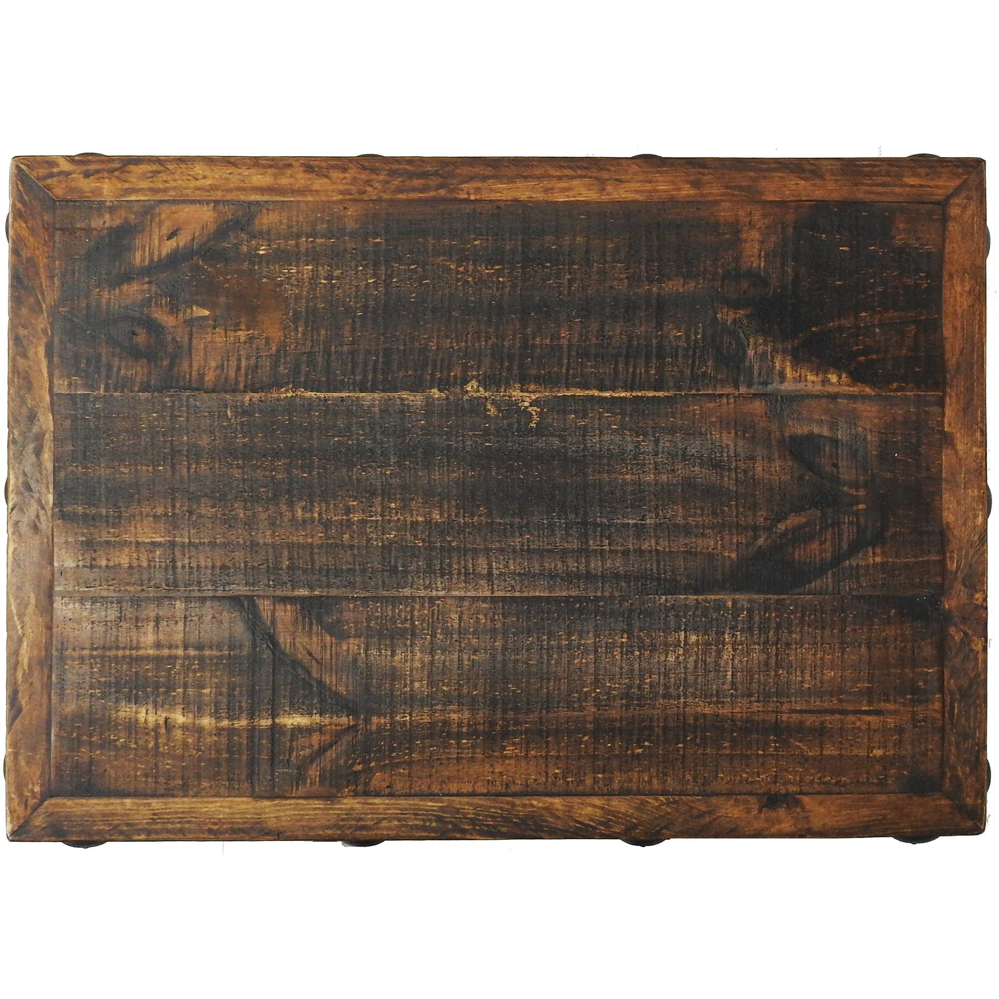 Designed without a bottom shelf to maintain its sleek silhouette, it is adorned with conchos around the top, adding a touch of Southwestern flair. The Oasis Rustic End Table is ideal for placing beside your sofa or favorite armchair, providing a convenient surface for lamps, books, or decorative items.