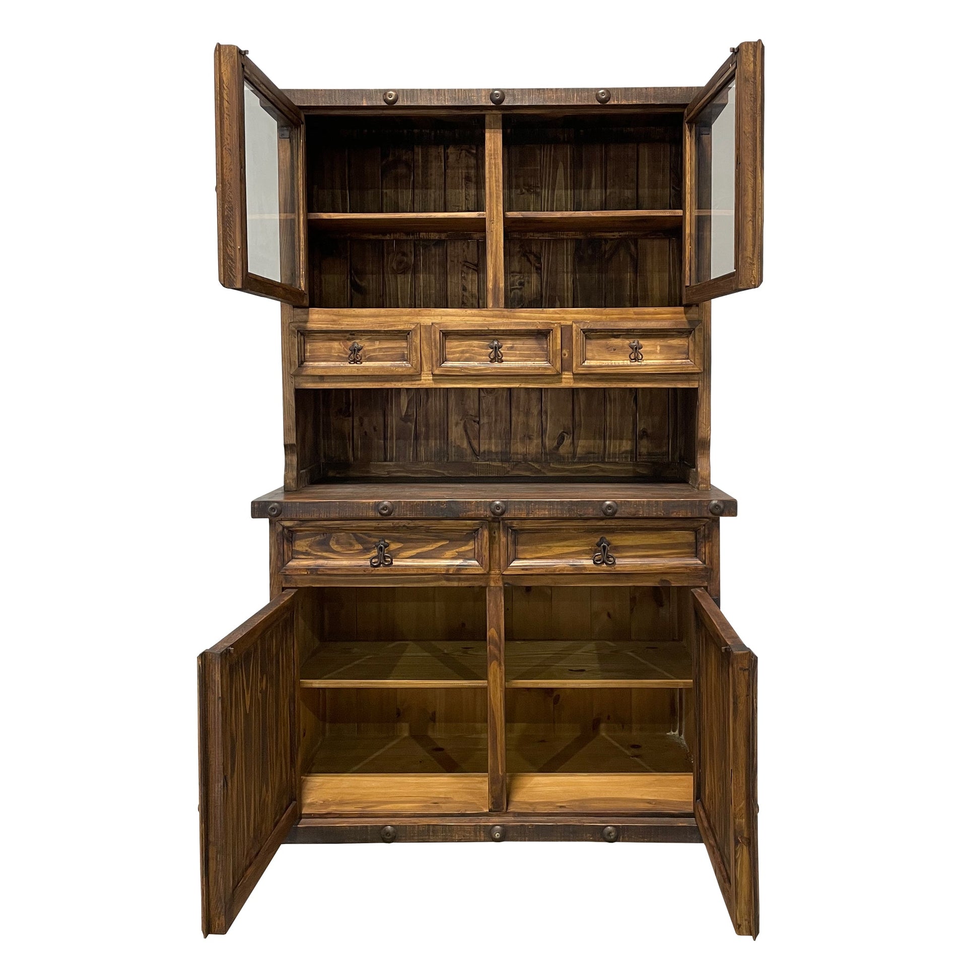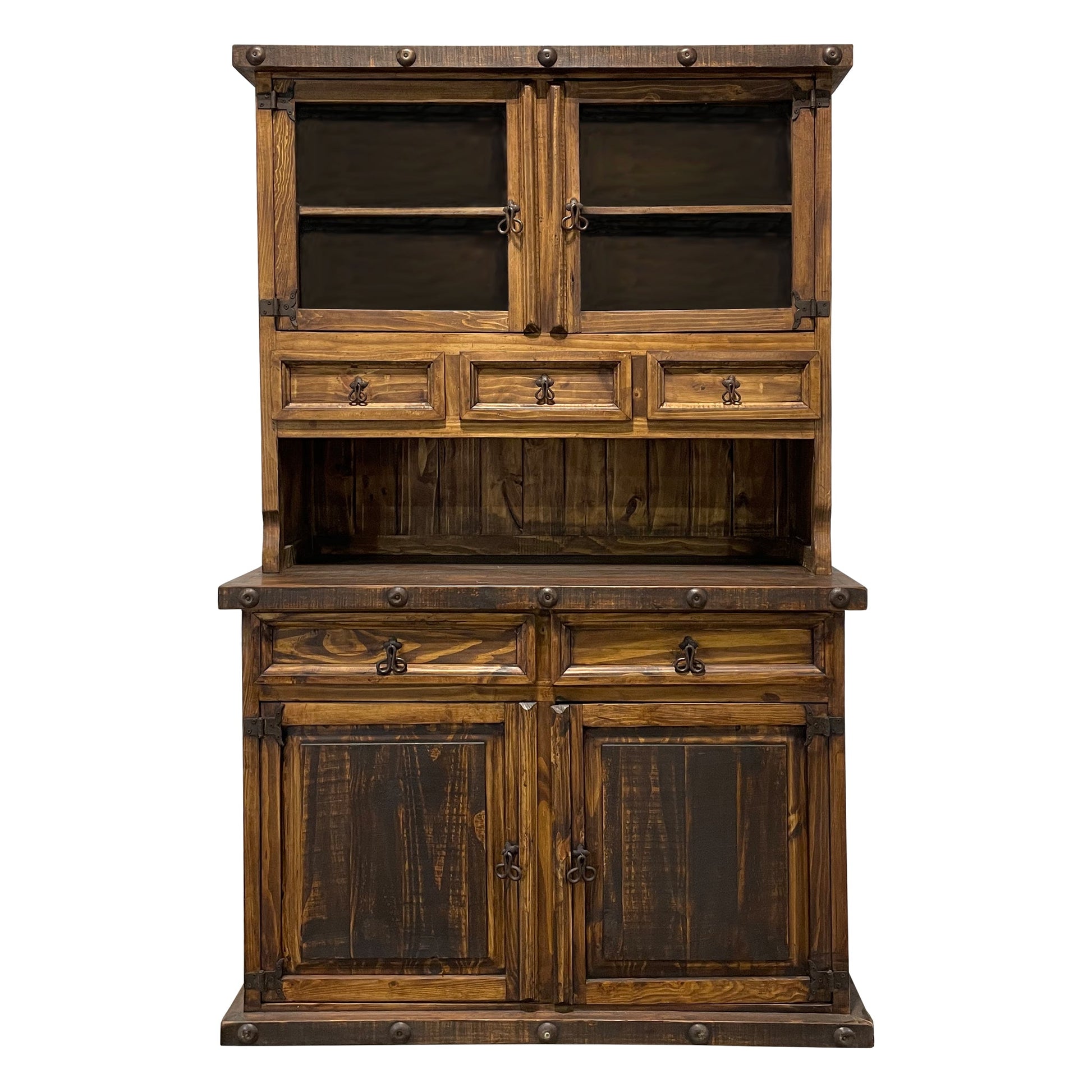 The bottom buffet section features two doors and two drawers, providing ample storage for your dining essentials. Its top and bottom trim are embellished with elegant conchos, adding a touch of southwestern flair.