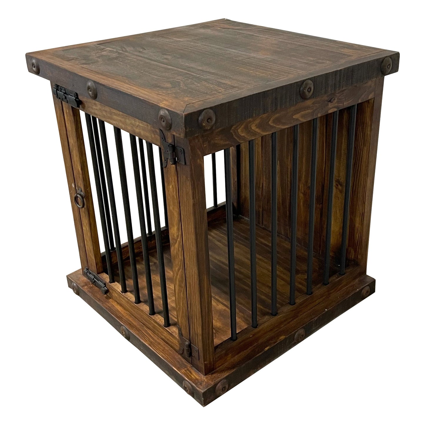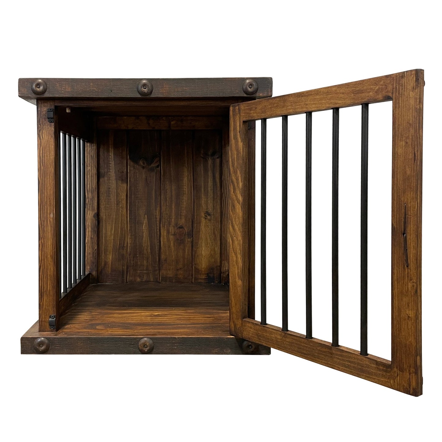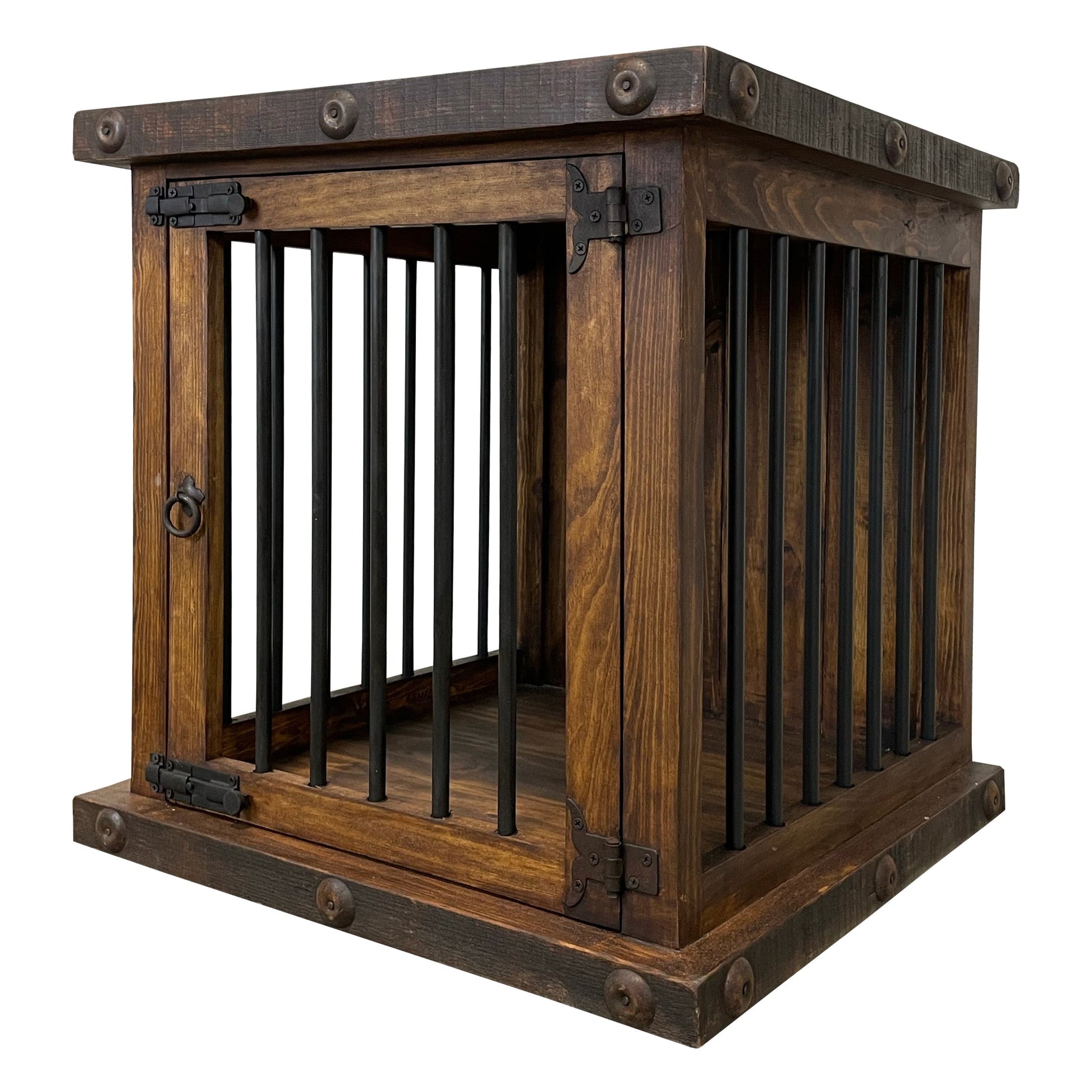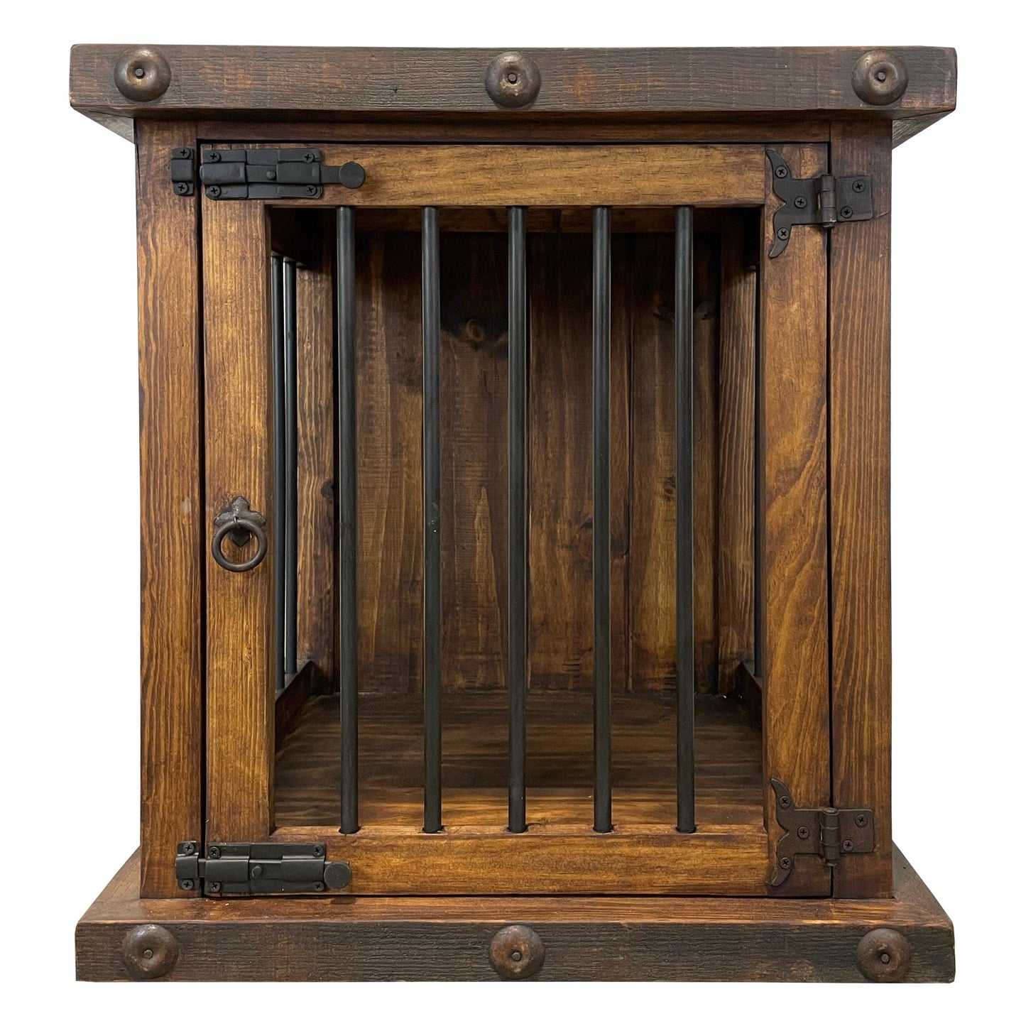 Adorned with decorative conchos around the top and bottom trim, the Oasis Small Rustic Dog Kennel adds a touch of southwestern flair to any room. Its versatile design allows it to serve as an end table or nightstand, providing both a cozy retreat for your pet and a practical surface for you.