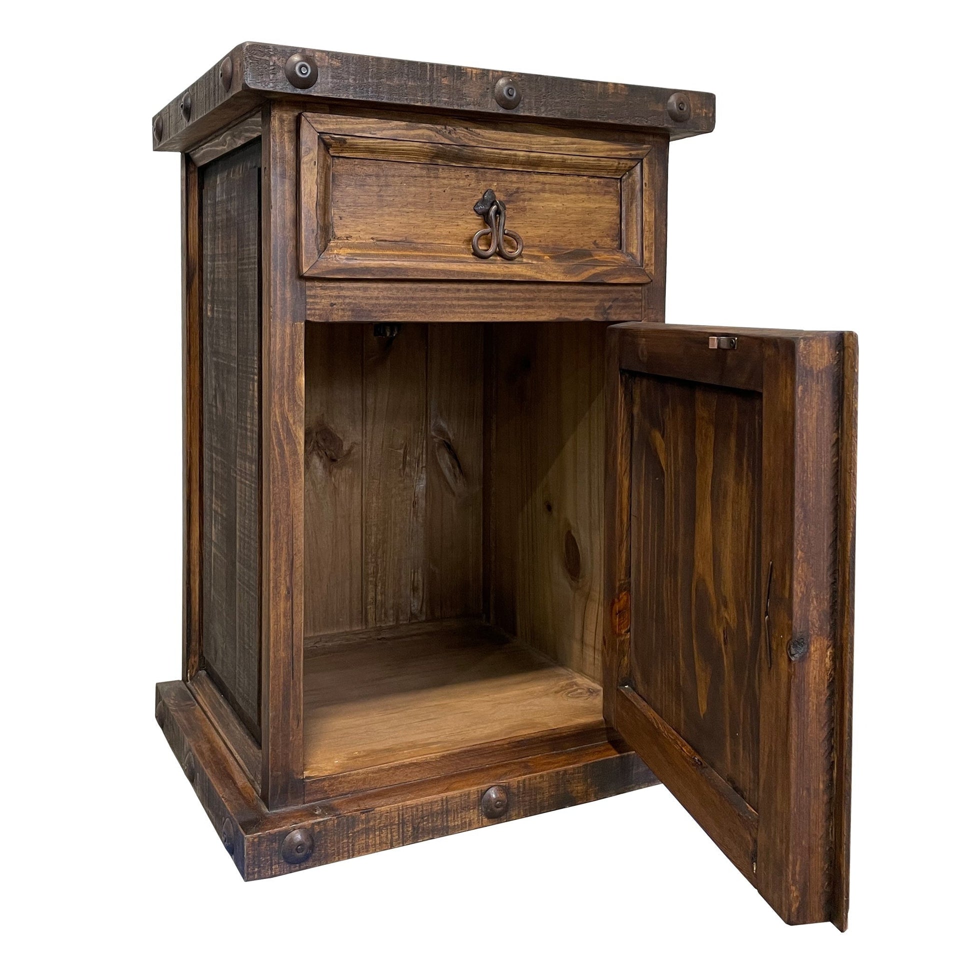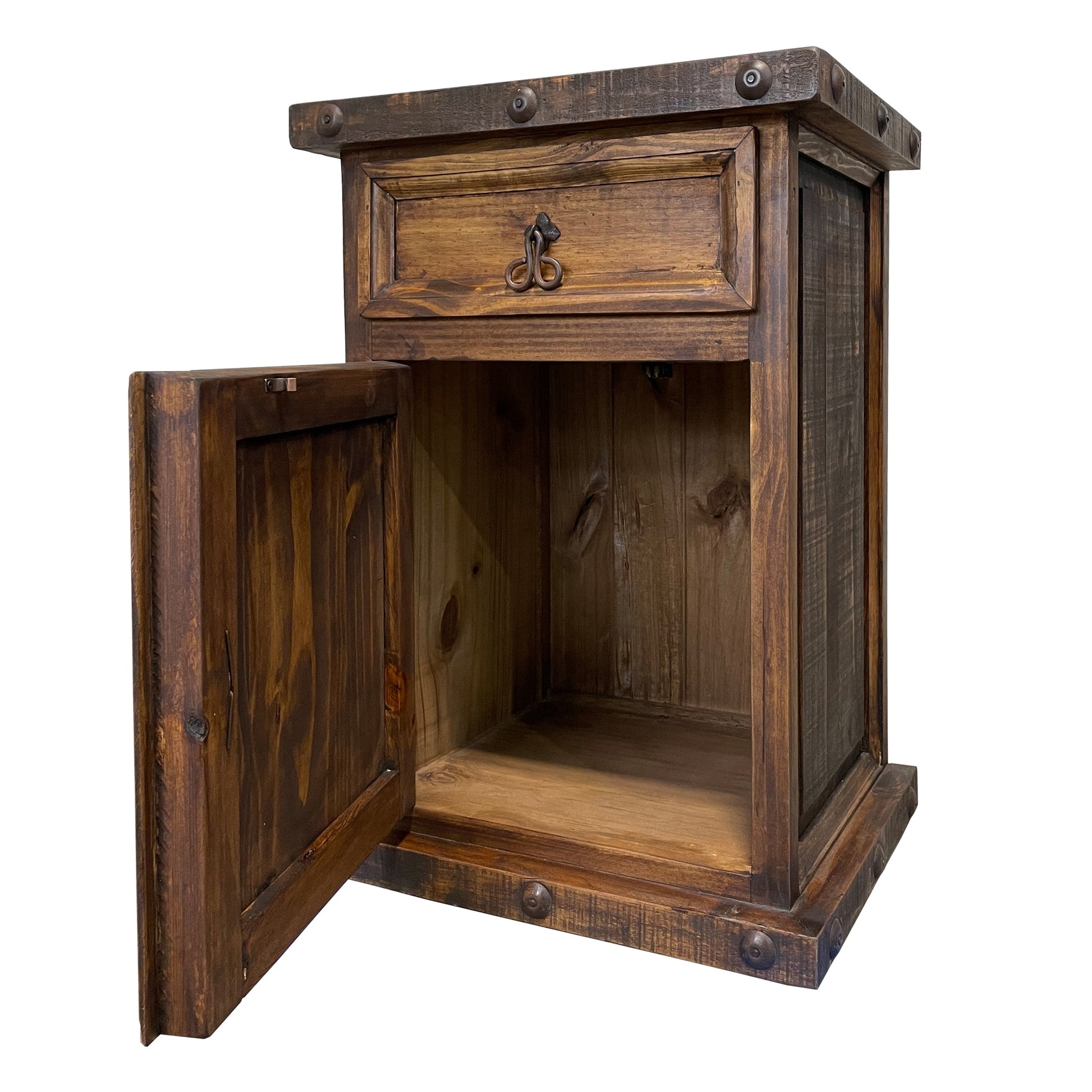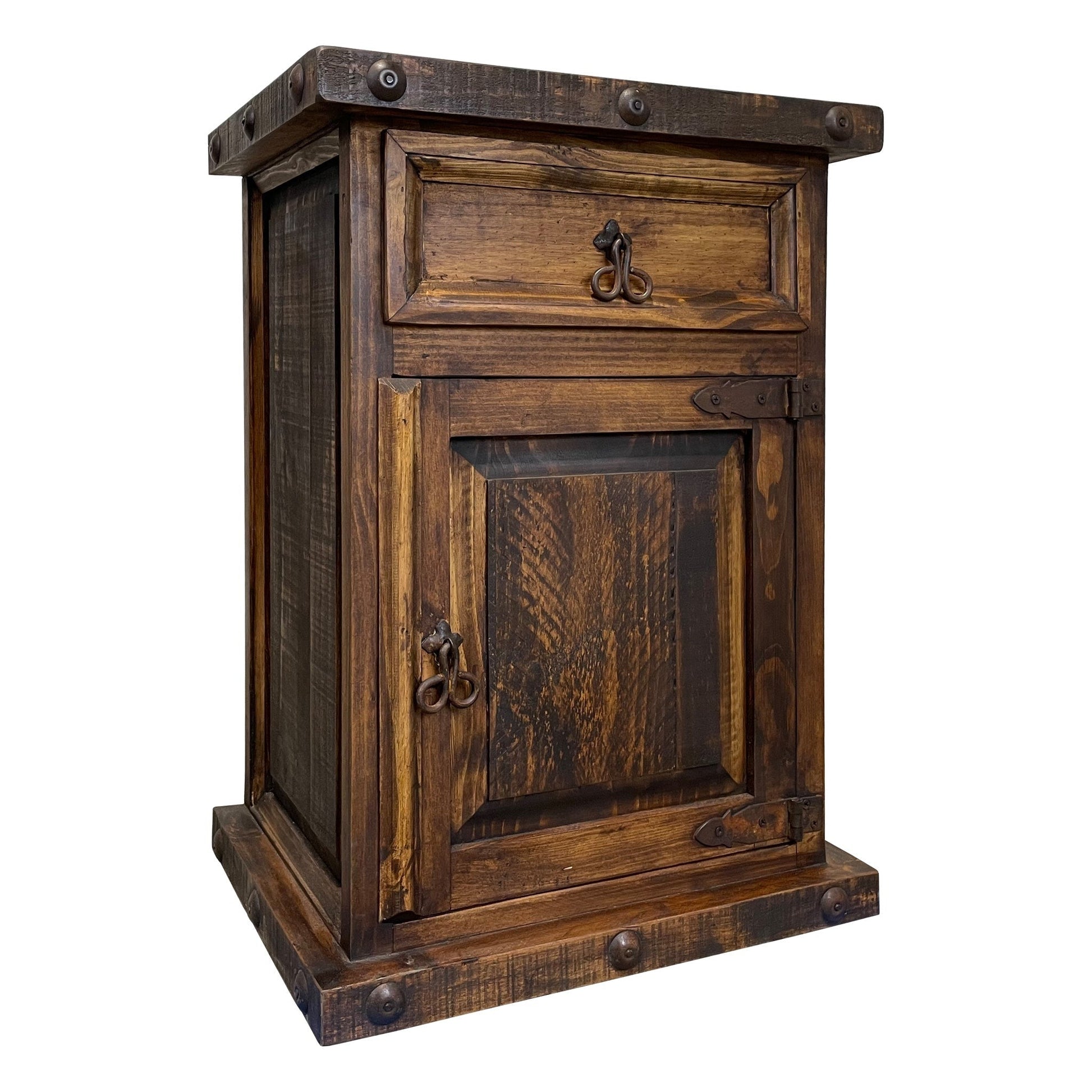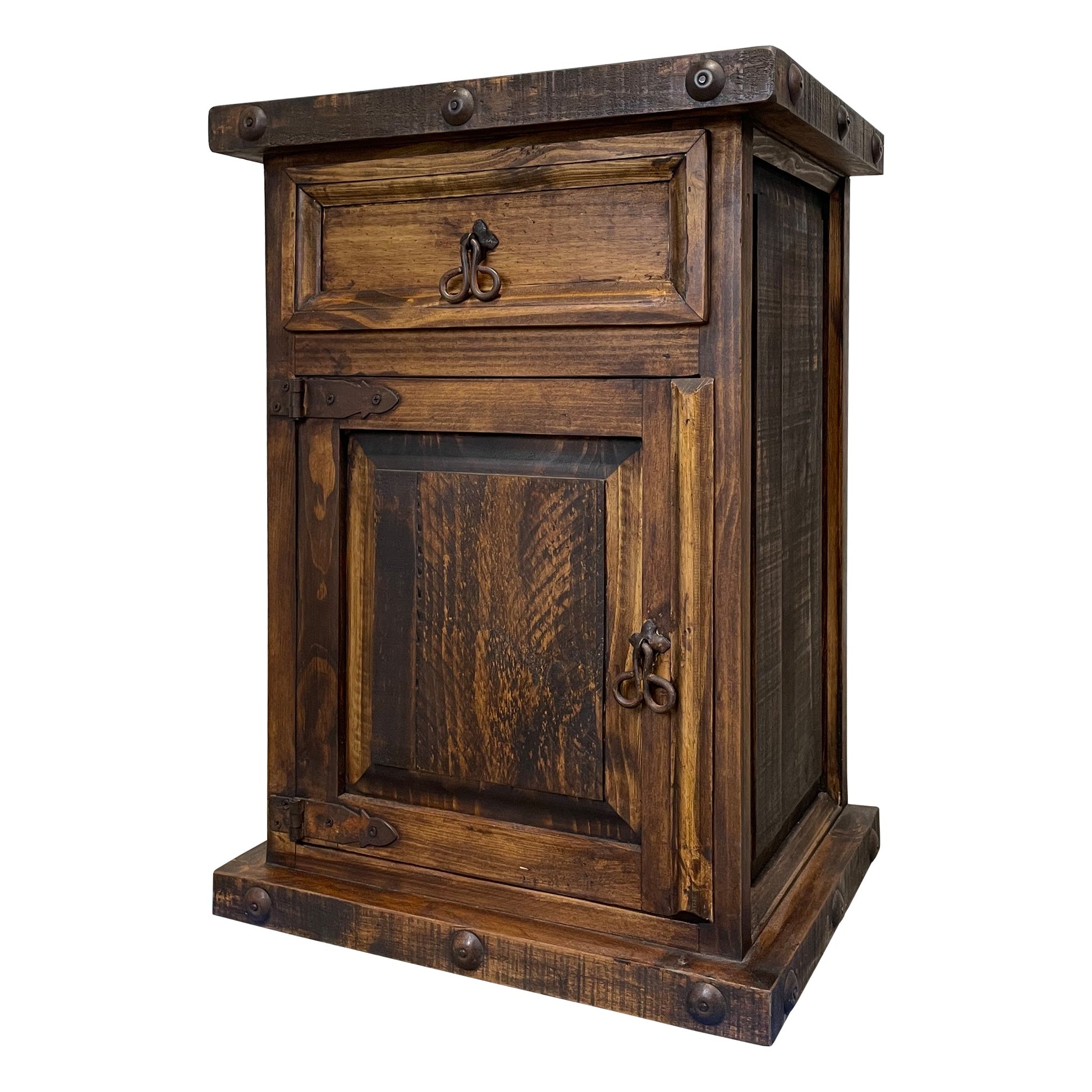 The Oasis Small Rustic Nightstand features a convenient drawer at the top, perfect for storing bedside essentials, while a door at the bottom provides additional enclosed storage space. Both the top and bottom trim are adorned with decorative conchos, adding a touch of southwestern style and enhancing its rustic appeal.