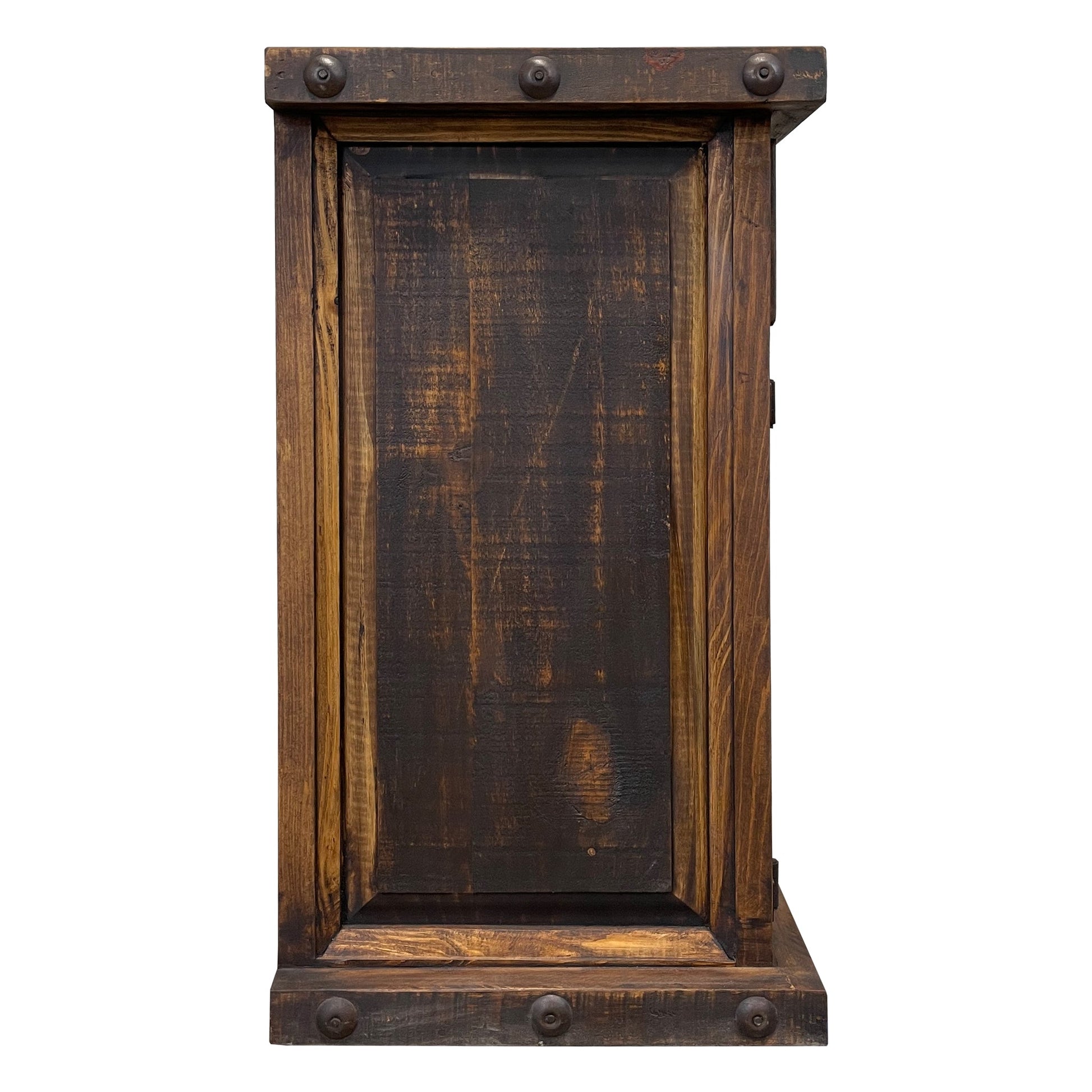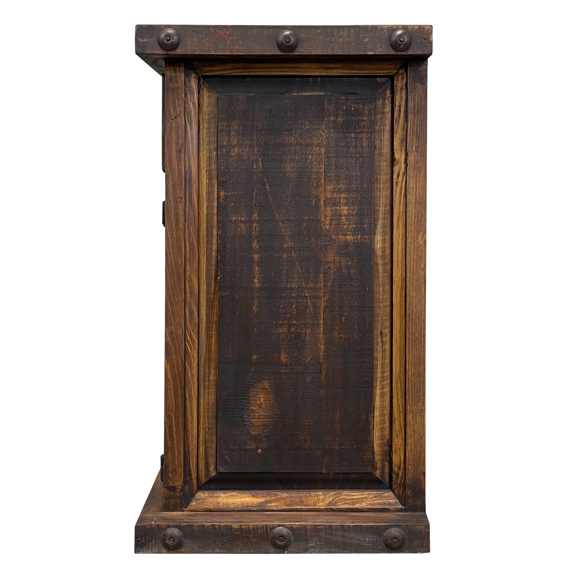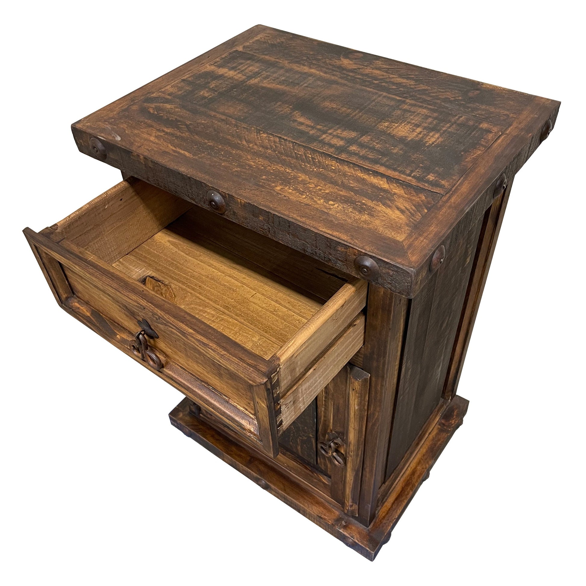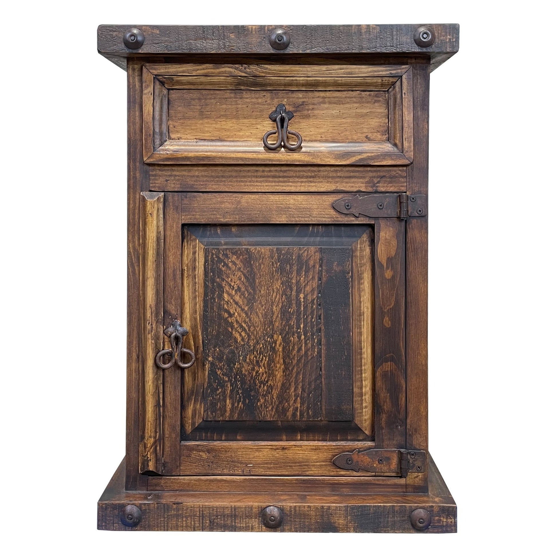 The Oasis Small Rustic Nightstand features a convenient drawer at the top, perfect for storing bedside essentials, while a door at the bottom provides additional enclosed storage space. Both the top and bottom trim are adorned with decorative conchos, adding a touch of southwestern style and enhancing its rustic appeal.