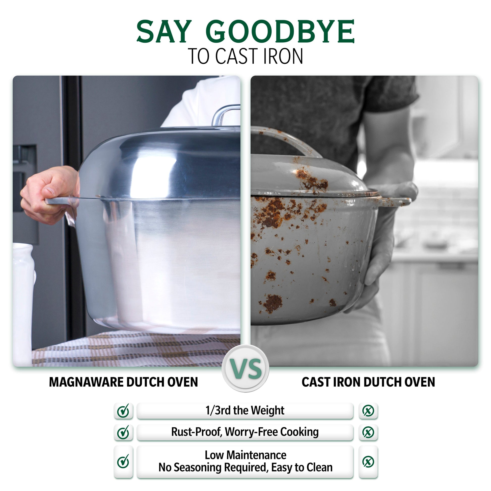 - Lightweight & Rustproof - Why struggle with heavy cookware? Our cast aluminum Dutch oven oval pot is a breeze to handle, weighing just a fraction of cast iron. Plus, it's super easy to maintain – no need for seasoning, and it won't rust!