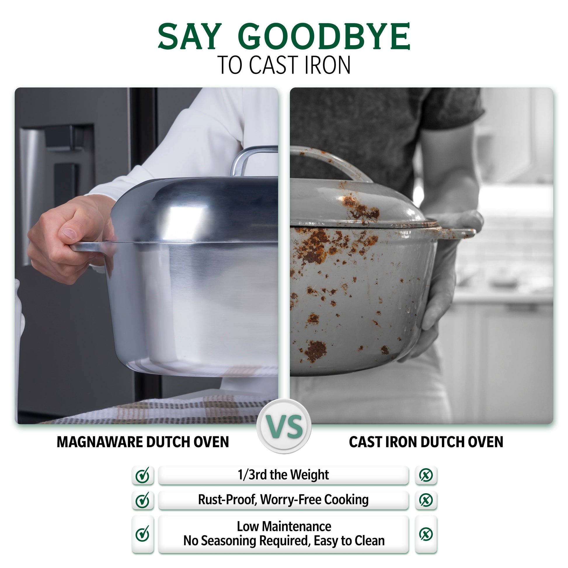 - Lightweight & Rustproof - Why struggle with heavy cookware? Our cast aluminum Dutch oven oval pot is a breeze to handle, weighing just a fraction of cast iron. Plus, it's super easy to maintain – no need for seasoning, and it won't rust!