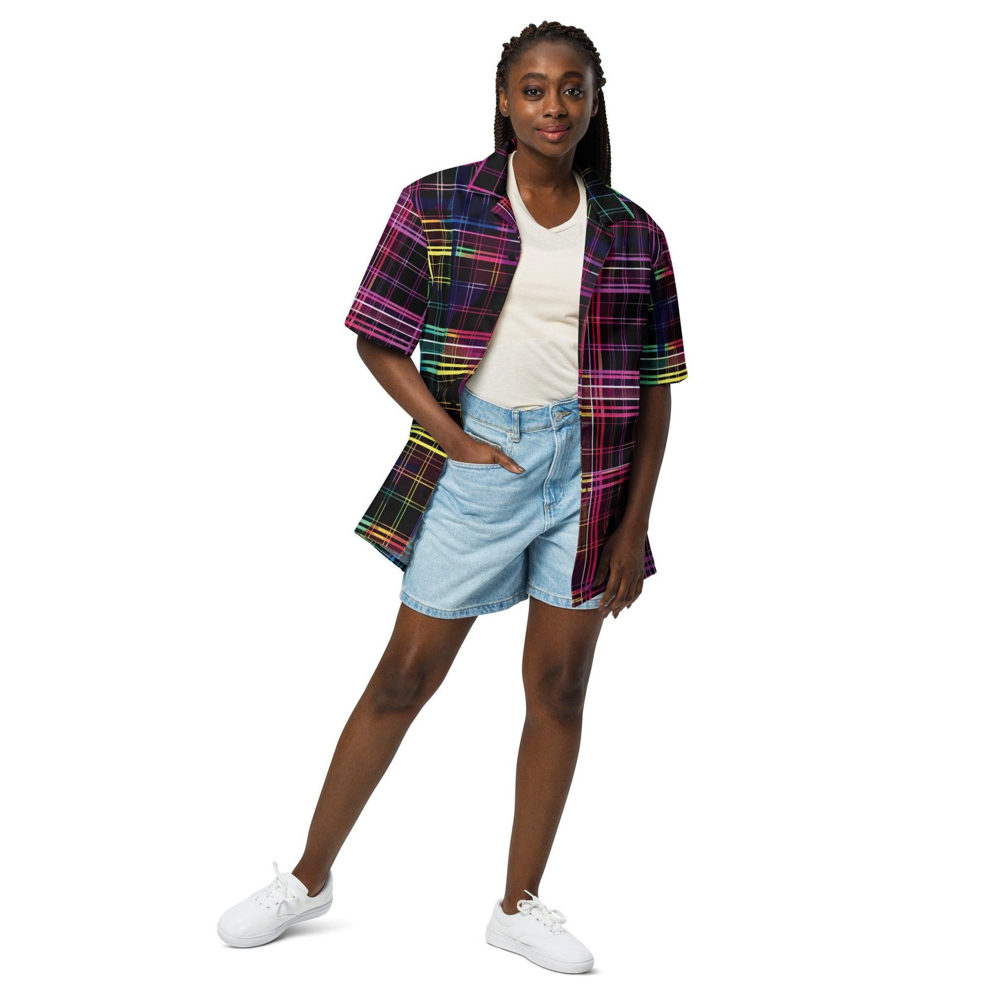 Our Playful Plaid Button Shirt is perfect for electrifying events, whether you're raving under the stars or soaking up the sun at a summer party. The lively plaid design is more than just a print; it's a celebration of color that will make you the center of attention. You'll shine brighter than the stage lights, and every dance move will be an expression of your style.