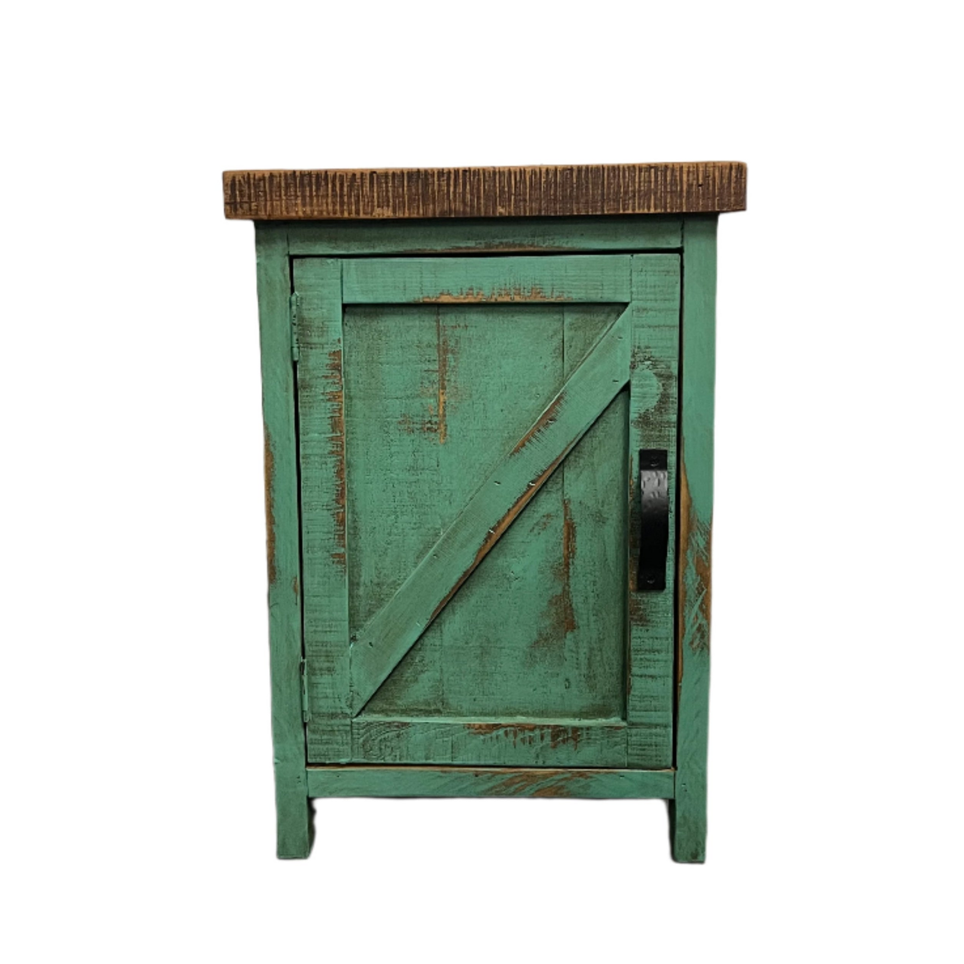 The Rancho Nightstand complements the Barn Bed and Dresser in Oldie Turquoise seamlessly, creating a cohesive rustic ambiance in your bedroom. Finished with black metal hardware for a touch of industrial flair, it combines durability with timeless style.