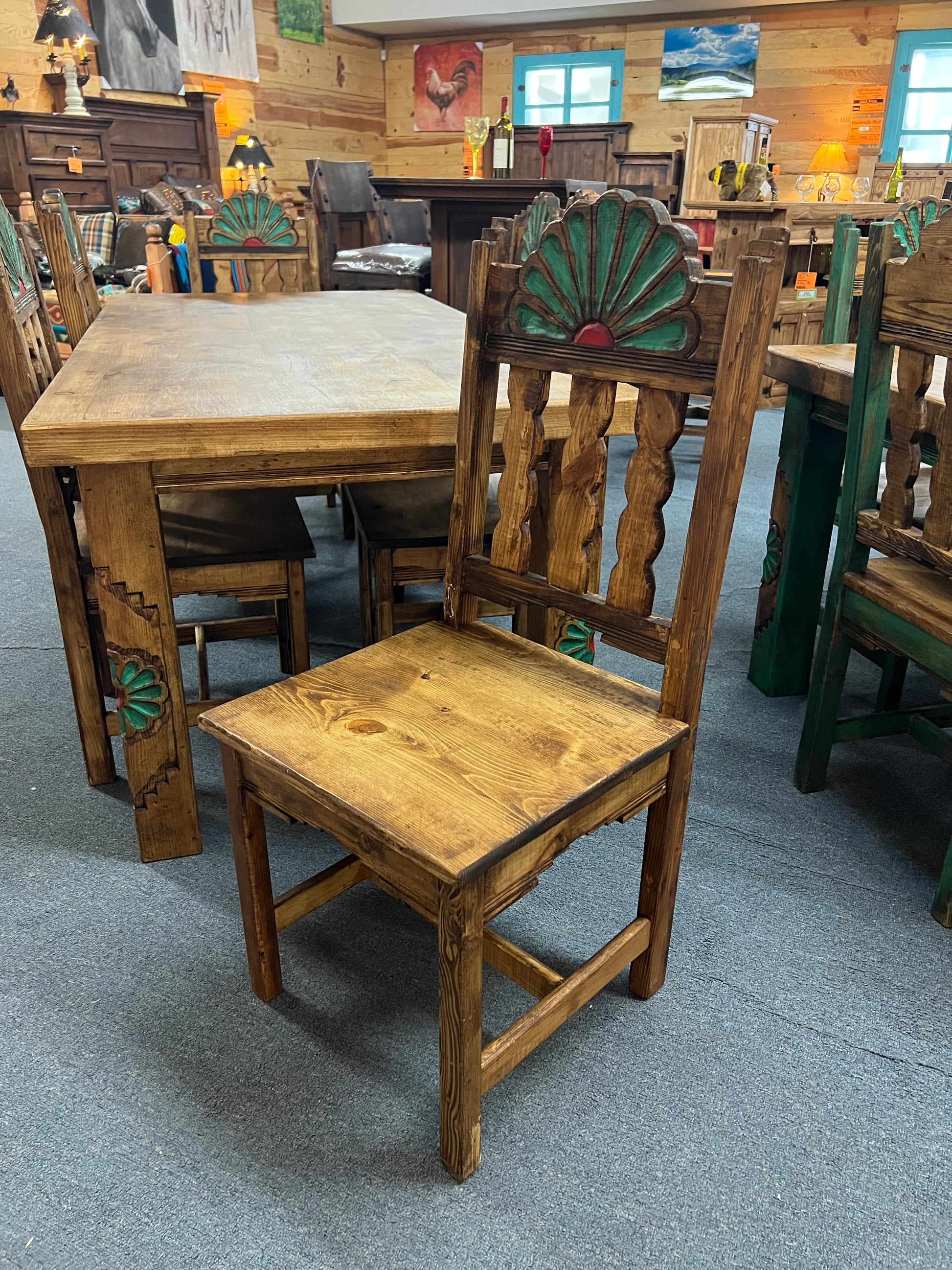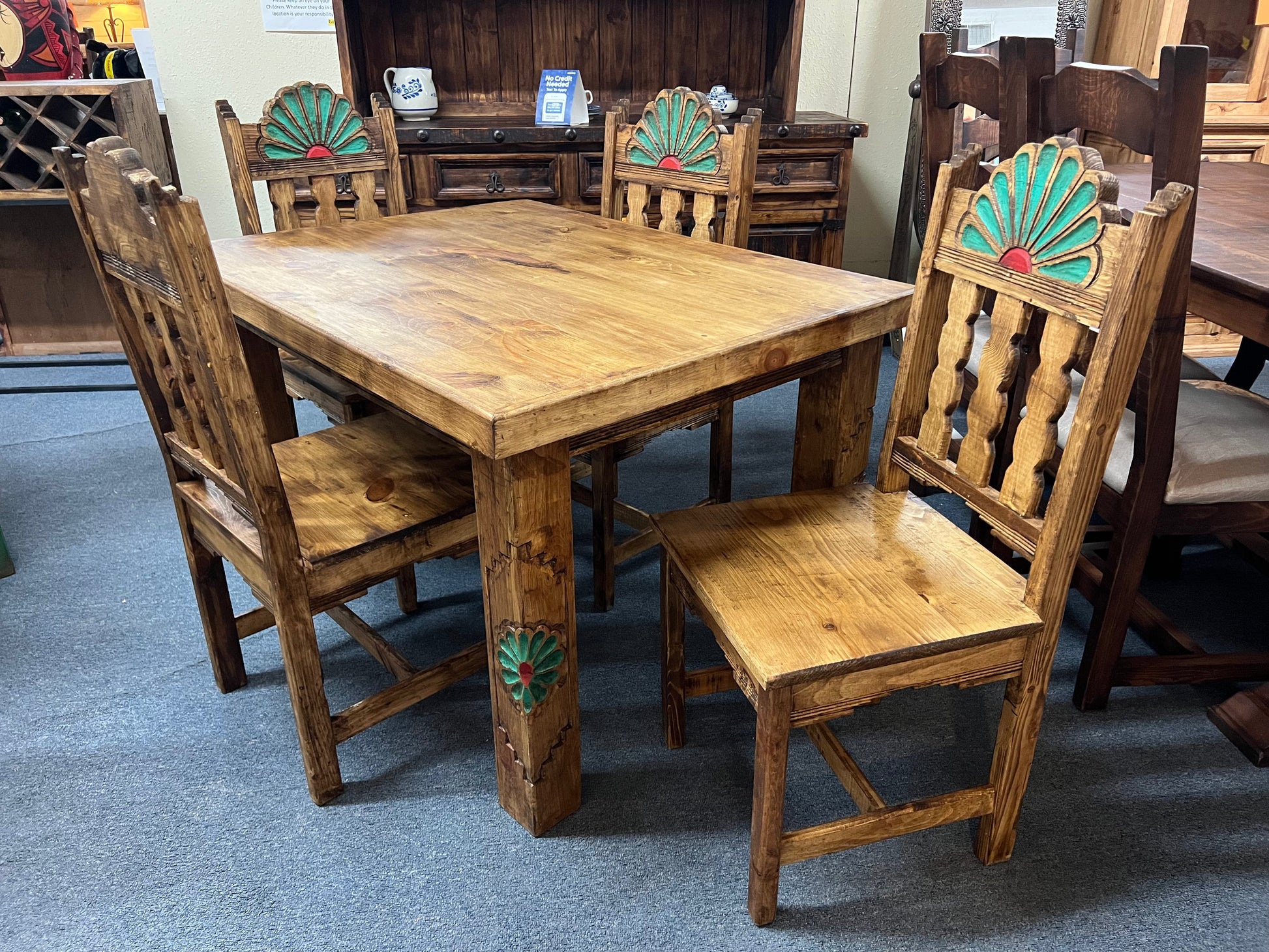 Measuring 4 feet wide, the table features a rich brown finish that highlights the natural grain of the wood, offering a warm and inviting centerpiece for your dining area. The legs are adorned with intricate Rosetta carvings, adding a touch of southwestern flair and artisanal detail to the design.