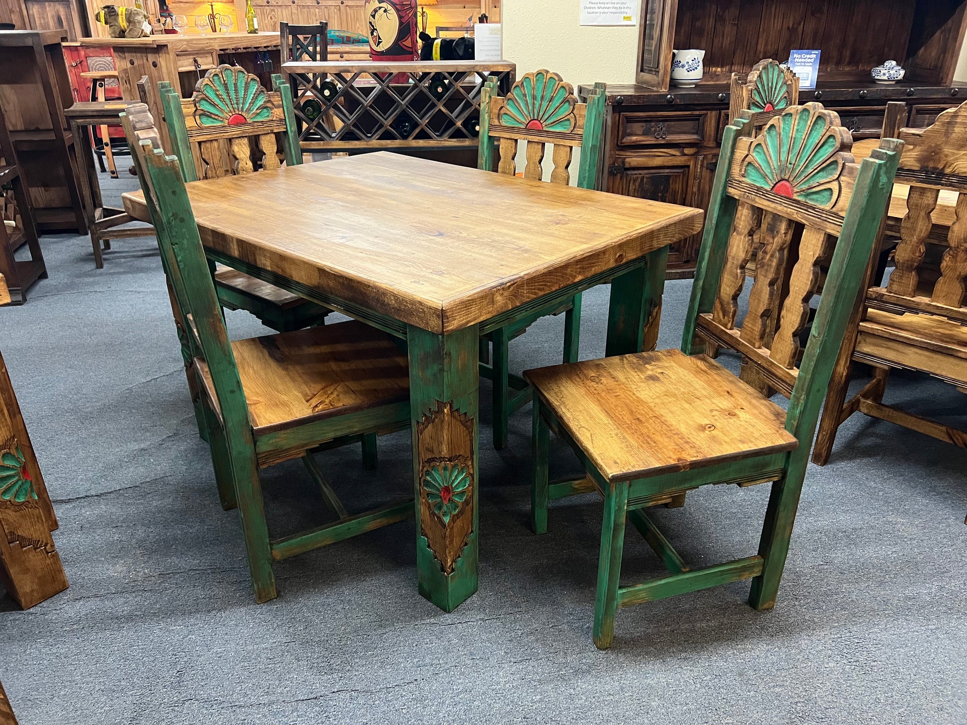 Embrace rustic elegance with the Rosetta 4' Dining Table in Green from Rustics For Less. Handcrafted from solid pine wood, this charming dining table combines sturdy construction with southwestern-inspired aesthetics.