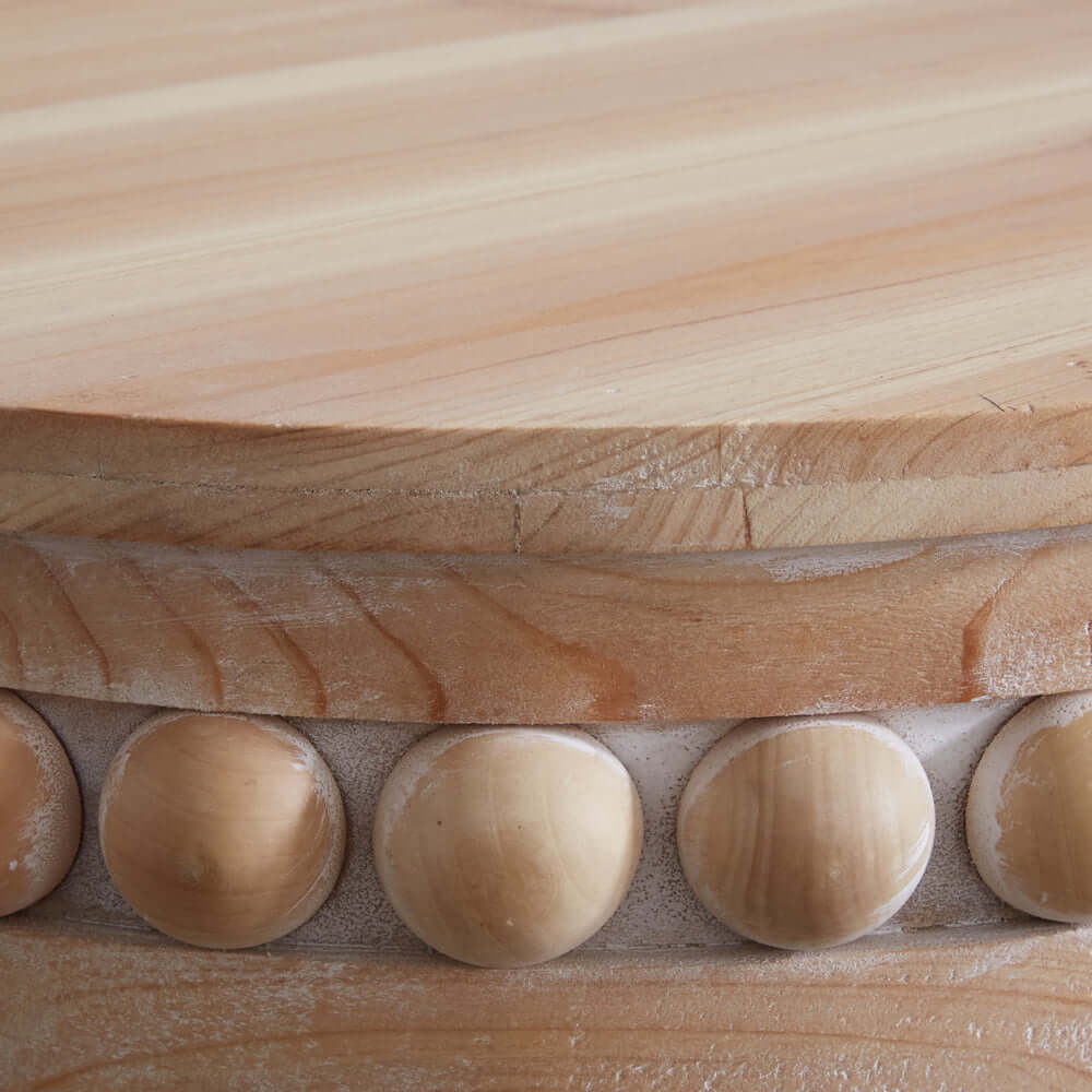 What sets this side table apart is its distinctive carved beaded detailing around the apron. The bold, rounded wood accents provide a unique textural contrast, giving the table a playful yet refined personality. These charming details add an artisan quality, creating a focal point that’s both visually appealing and full of character. It’s a delightful way to introduce a subtle boho accent without overwhelming the space, making it a versatile addition to your home decor.