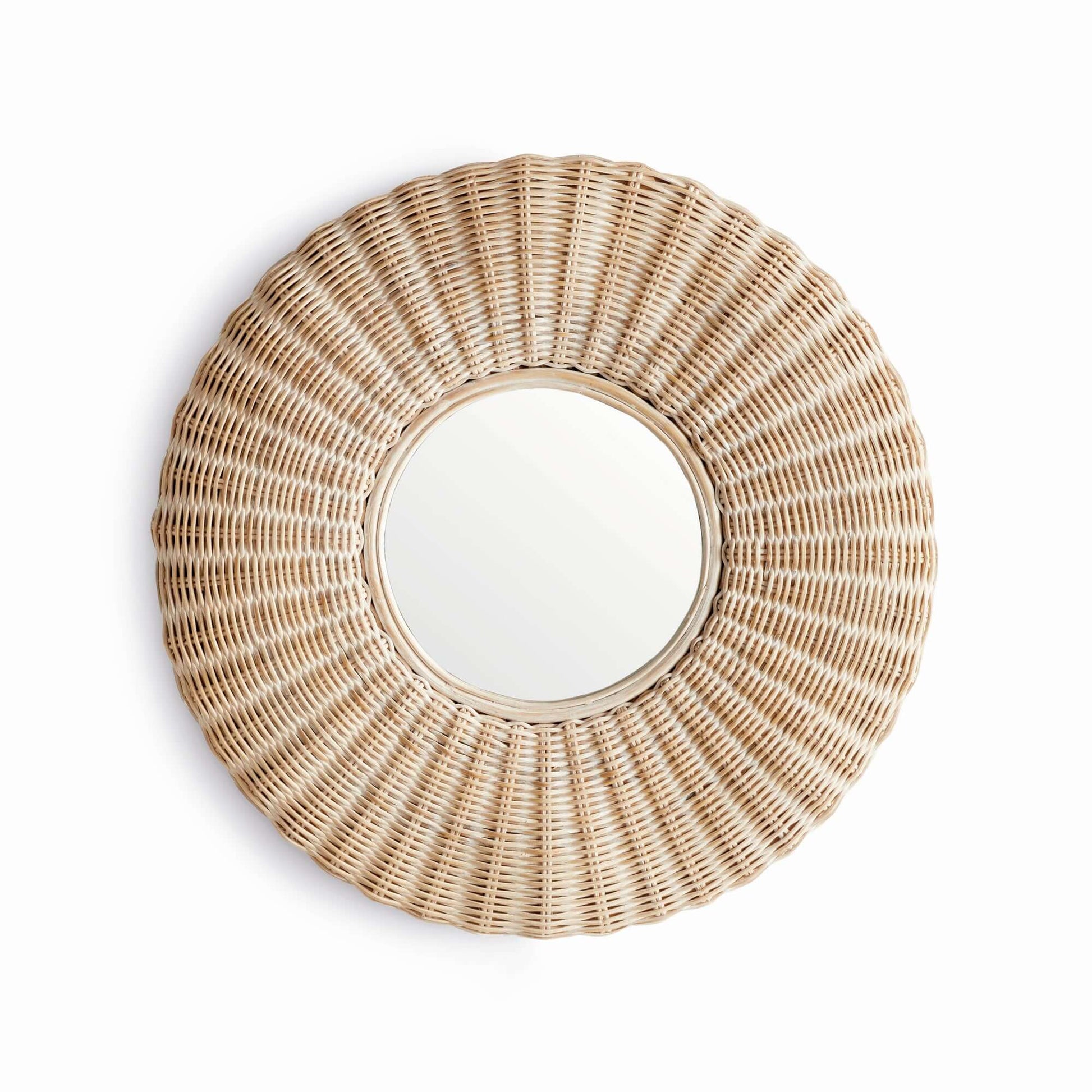 Bring a sense of sun-soaked serenity into your space with this round woven rattan wall mirror, a true celebration of artisanal craftsmanship and vintage-inspired design. Intricately handwoven from natural rattan, the mirror’s circular frame fans out in a soft, radial pattern—evoking memories of rattan sunburst mirrors that once adorned the breezy interiors of mid-century beach houses and bohemian hideaways. Its natural finish and textured weave radiate warmth, creating a grounded and effortlessly elegant focal point.