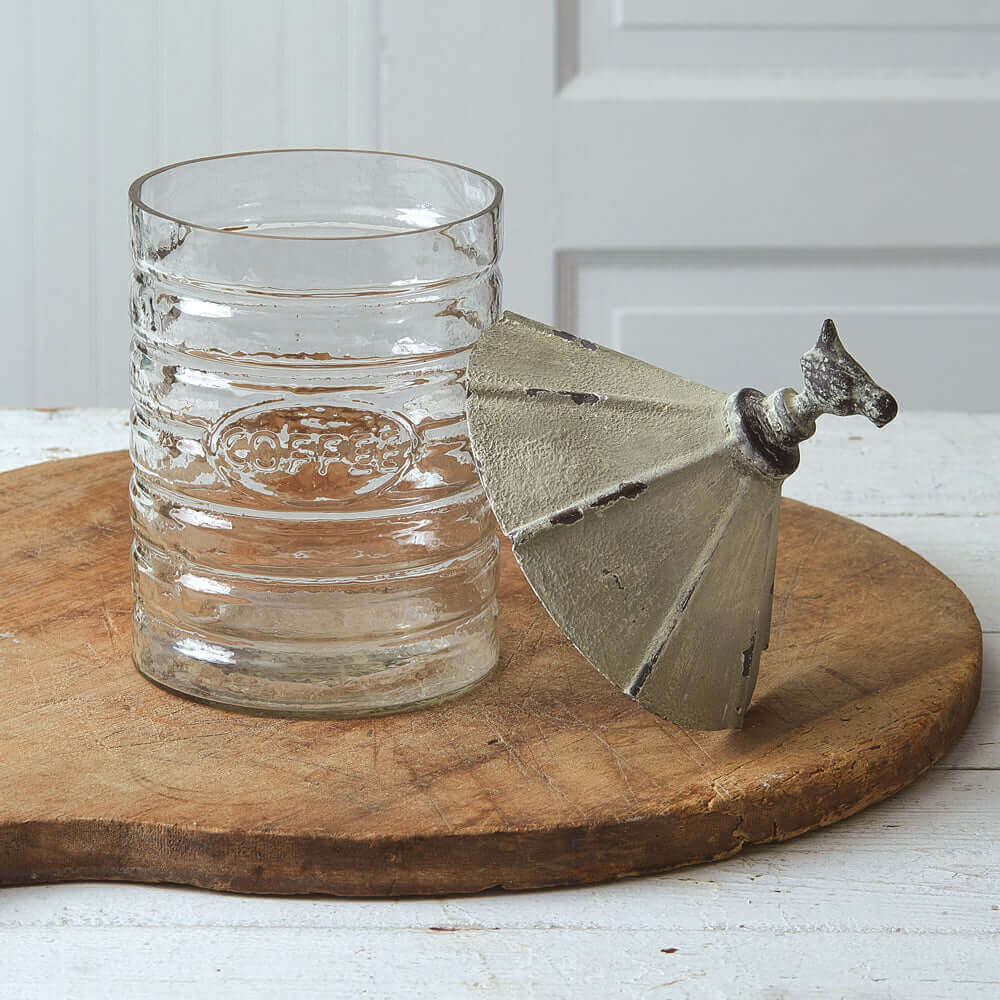 This rustic farmhouse silo coffee canister brings some old vintage inspired storage to your kitchen, and makes it easy to see how much coffee you have left with the glass canister. Heaven forbid you run out! The glass canister also has the word, "Coffee" displayed, and lets not forget the adorable little songbird perched on top of the metal silo lid, who completes the vintage country farmhouse vibe.