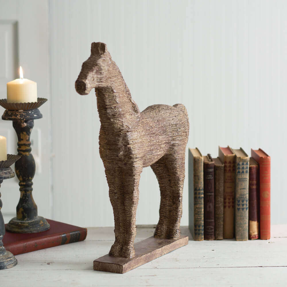 The perfect gift for horse lovers, our horse statue is made of resin and made to resemble the look and feel of wood. The textured chiseled finish creates a rustic and distressed effect that will have the horse fit perfectly into vintage, farmhouse or country inspired interiors. Place the handsome horse statue on your mantel, tabletops or shelves.