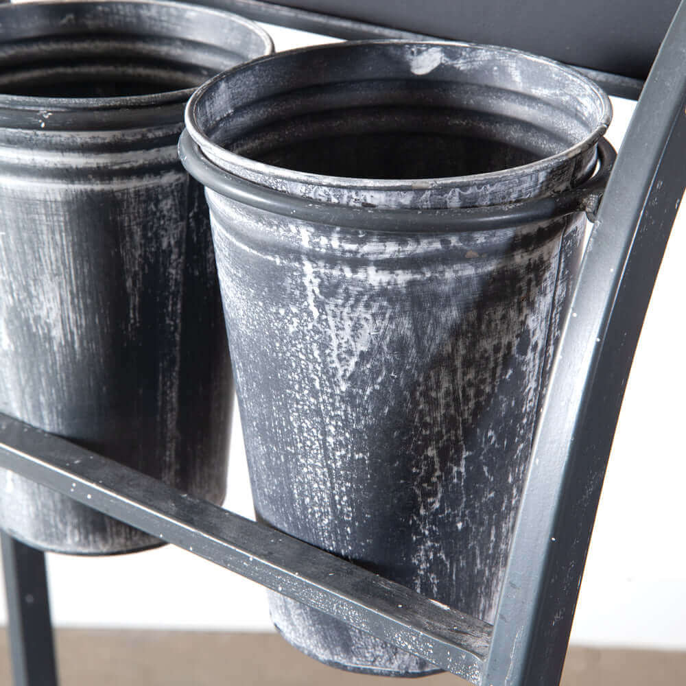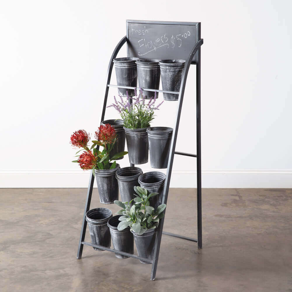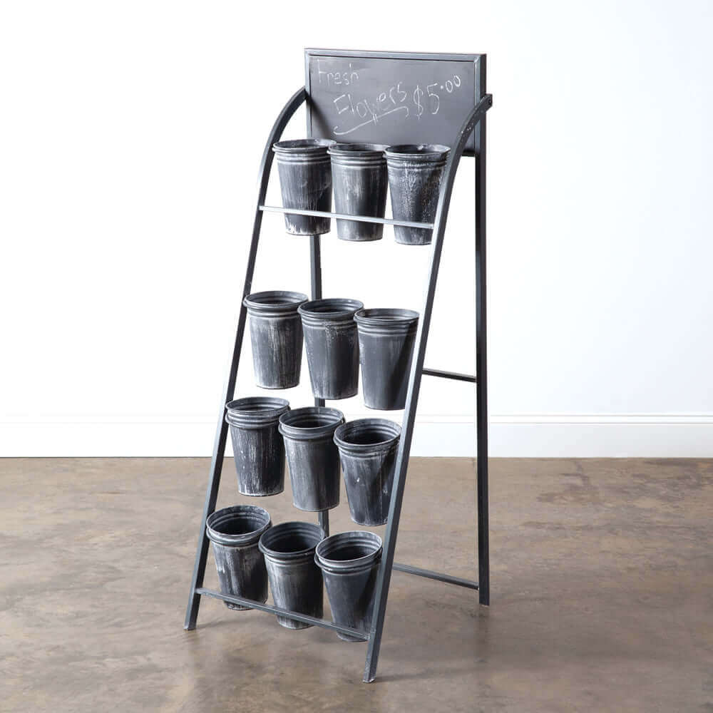 This unique standing organizer offers a novel way to organize items and supplies, or display your favorite flowers. Either way, the rustic storage solution includes 12 buckets/containers for you to use as you see fit. A chalkboard is mounted above the containers, providing you an opportunity to display a message.