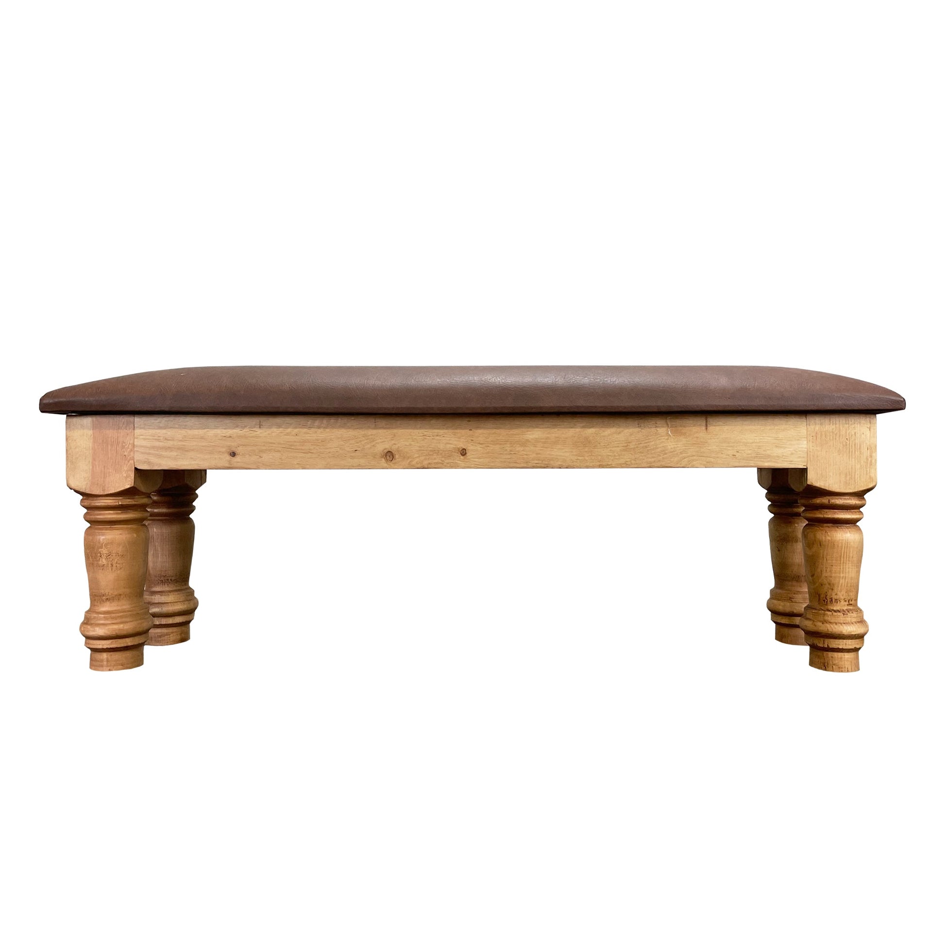 The Santa Rita Rustic Bench features elegant turned legs and a sturdy wooden frame, complemented by a plush brown vinyl cushion for added comfort. Whether placed in a hallway, at the dining table, or at the foot of your bed, it provides a cozy seating option with a touch of southwest or western-inspired decor.