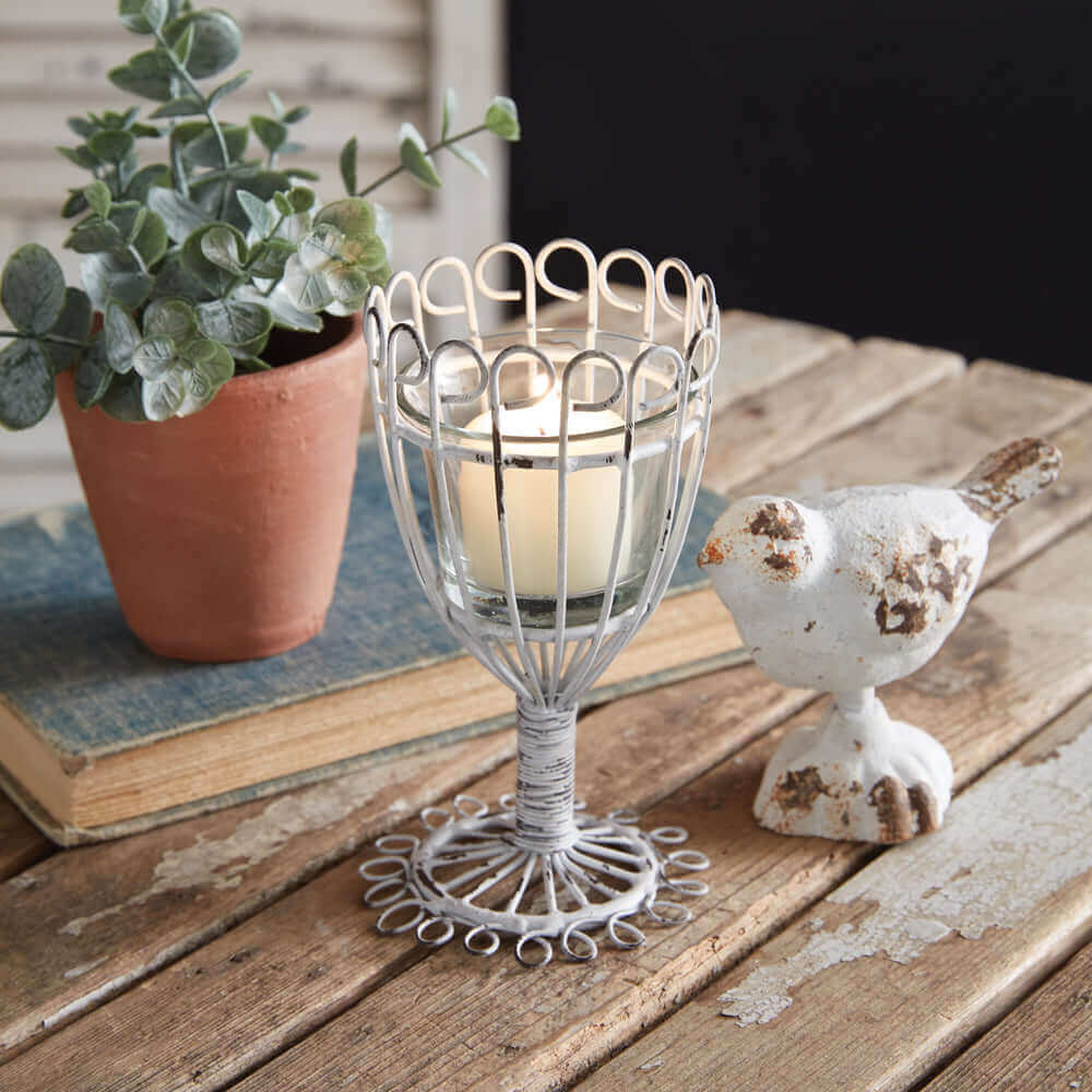 Reminiscent of flowers, these shabby chic goblet votive candle holders are the perfect way to add some delicate romantic lighting to your tabletops. The white distressed metal wire is formed to resemble a goblet with its sturdy pedestal and cup for holding the votive candle securely. The old world aesthetic makes these rustic candle holders perfect for any vintage or French country styled interior. Each candle holder has a small footprint at around 3" in diameter, making them a great fit for any tabletop that will bring a delightful shabby chic style to your interior design.