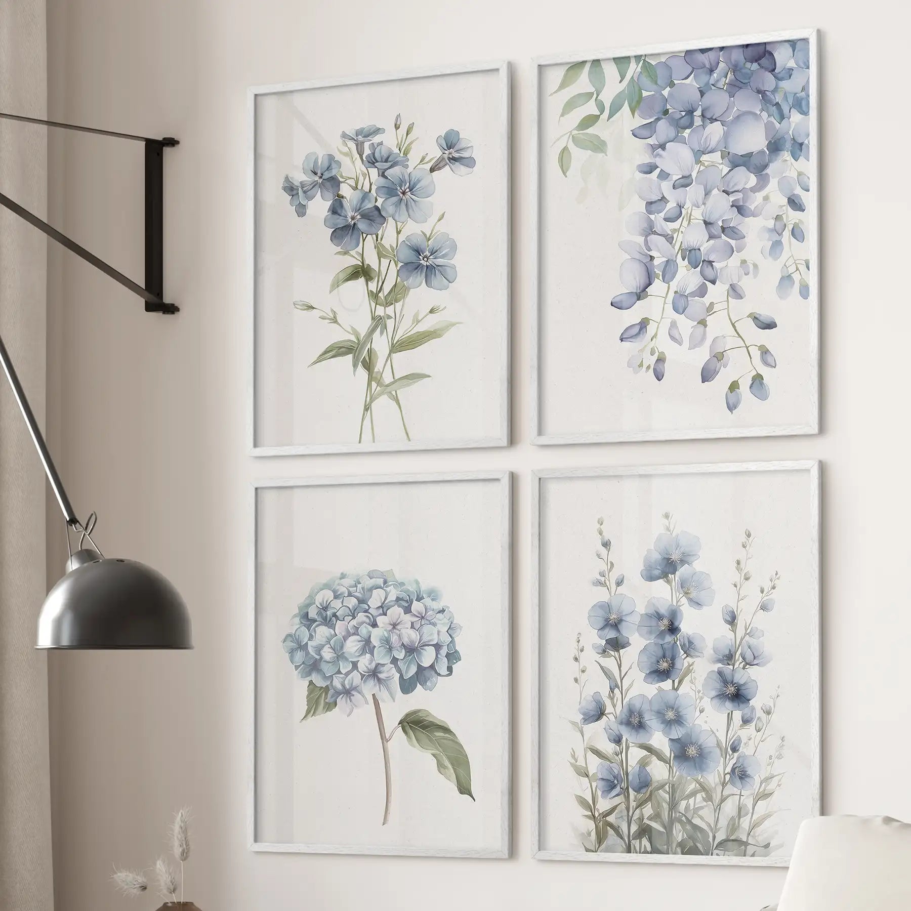 Bring a soft, serene touch to your home with this 4 piece blue botanical wall art set. Featuring watercolor style illustrations of hydrangeas, flax, wisteria, and wildflowers. Perfect for bedrooms, gallery walls, or peaceful reading nooks.