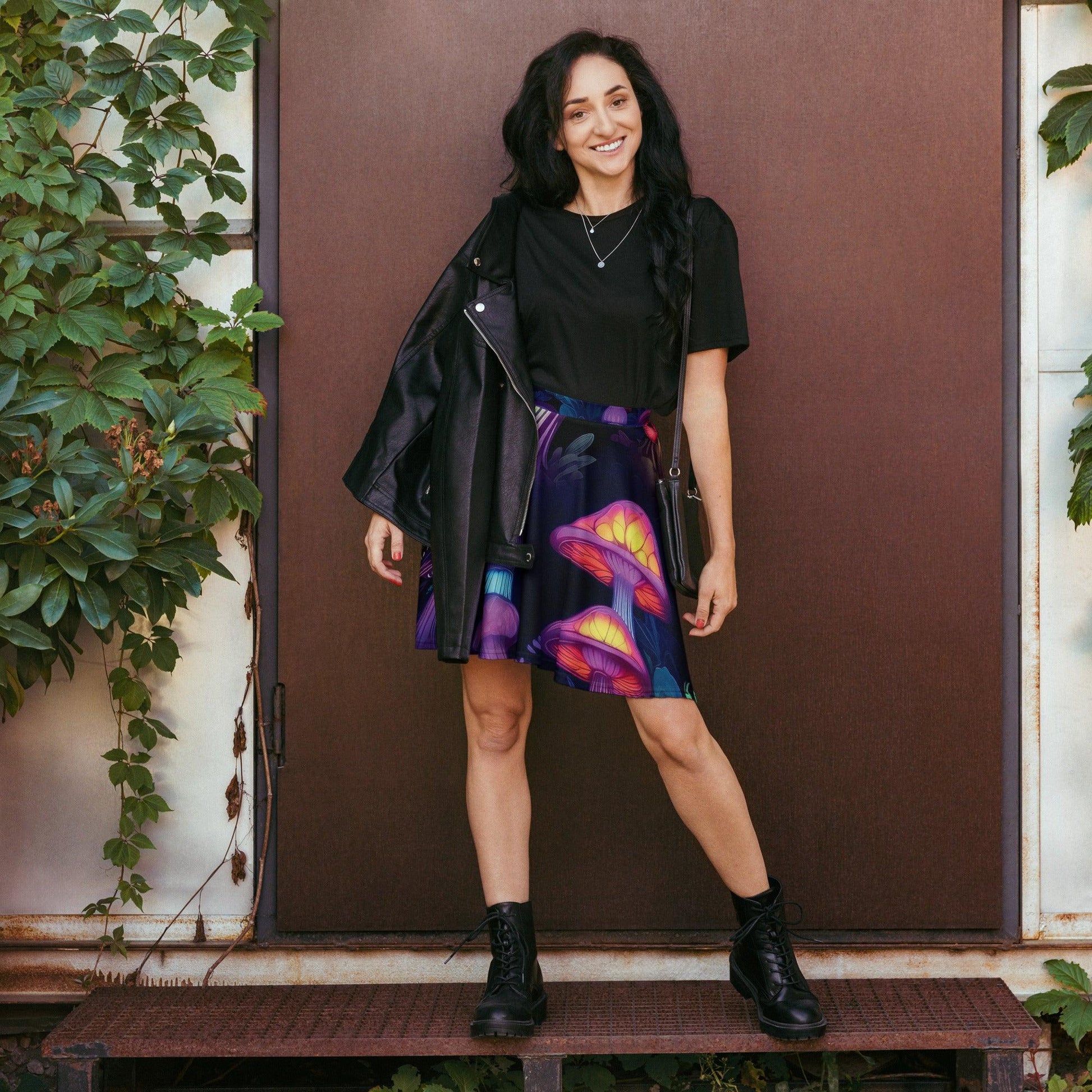 Ignite your festival spirit and let your creativity flow with our Vibrant Mushroom Skater Skirt. This lively and whimsical piece is your key to turning heads as you dance under the stars at raves and music festivals. Imagine the pulsating beats and the shimmering lights, as this unique skirt brings your festival wardrobe to life, embracing your individuality with every twirl.