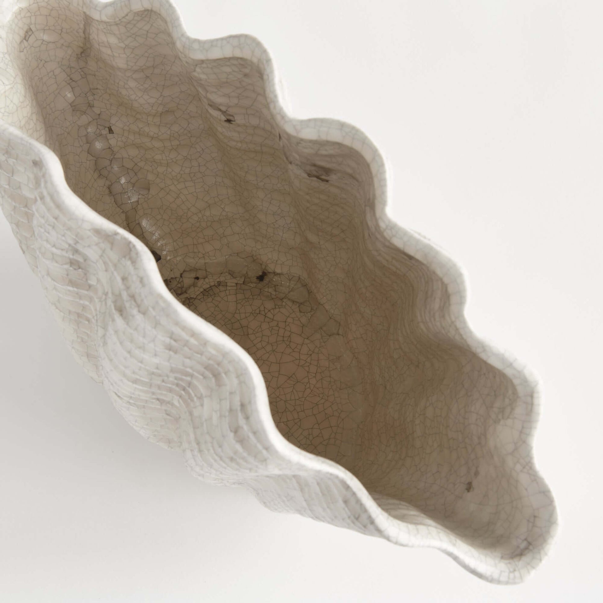 The sculptural shape is inspired by the natural curves of a giant clamshell, rendered in soft ivory tones with a subtle antiqued finish. The crackled glaze adds a layer of vintage authenticity, reminiscent of heirloom ceramics passed down through beachside generations. The vintage coastal ceramic shell vase is generously scaled, making it a stunning centerpiece for a rattan console, an ottoman draped in linen, or a driftwood kitchen island warmed by morning light.