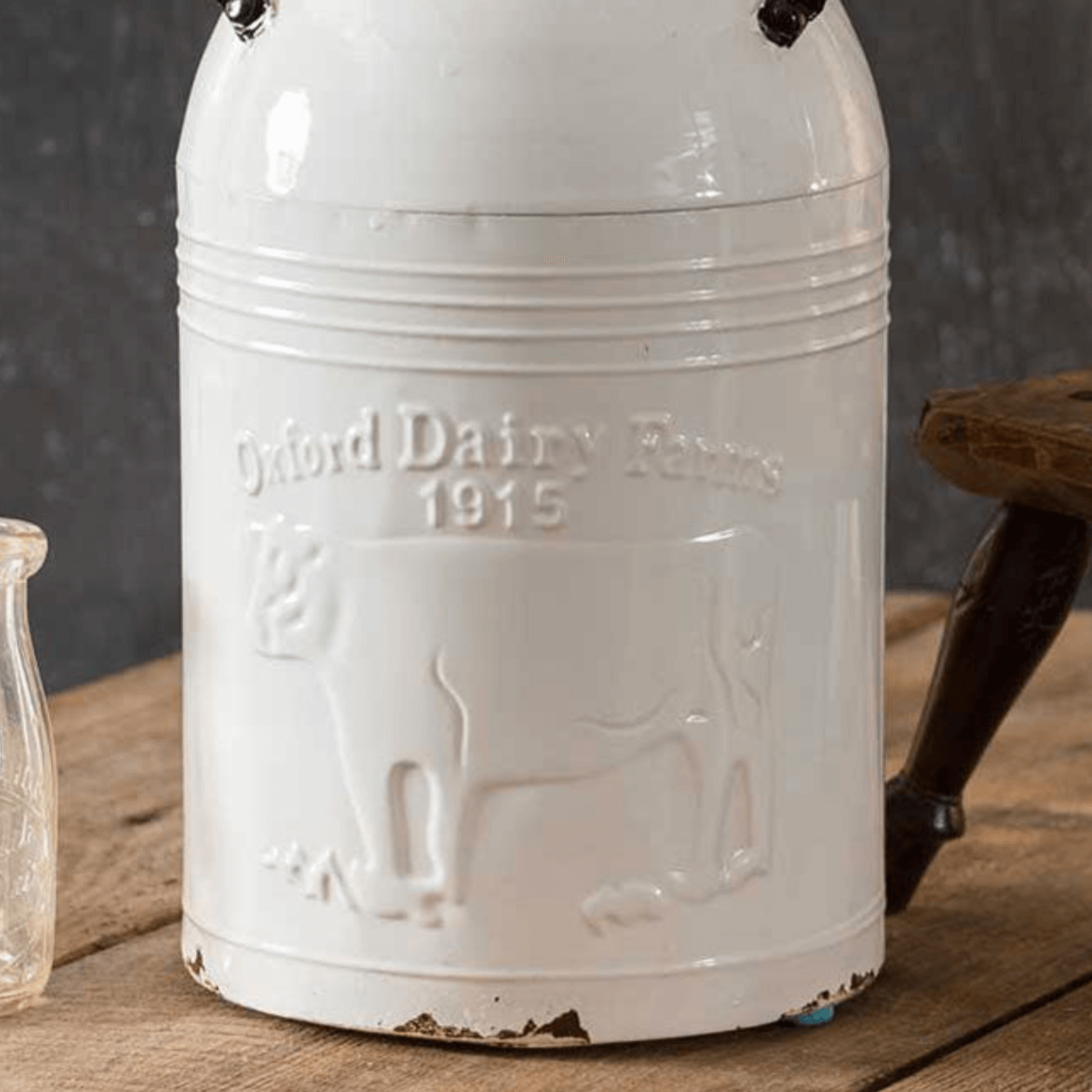 This vintage farmhouse white enamel milk can brings the quiet beauty of rural life into your home, evoking the simple pleasures of early 20th-century dairy farms. Embossed with Oxford Dairy Farm 1915 and a graceful cow motif, this piece feels like it was plucked right off a countryside porch or an old wooden milk cart rumbling down a dirt road. It’s not just décor—it’s a story told in enamel and steel.