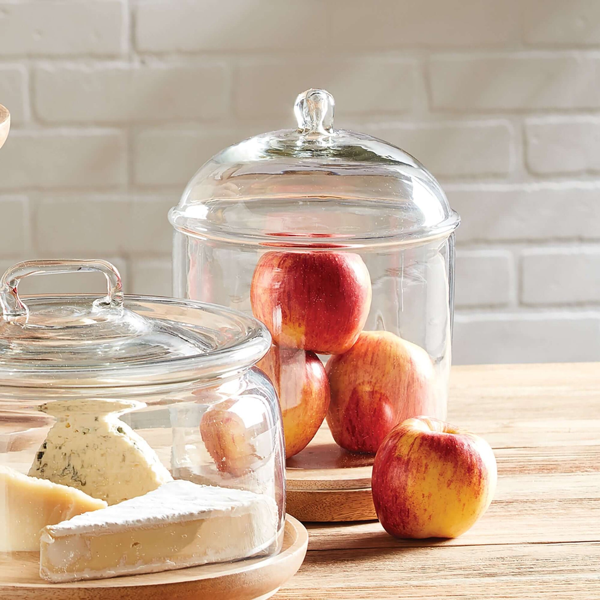 Crafted from thick, transparent glass, the cloche offers a delicate sheen that reflects natural light beautifully, making it ideal for showcasing everything from fresh fruit and baked goods to curated seasonal decor. The rounded dome rests securely atop a warm, natural wood base with a subtle grain and honeyed hue, reminiscent of vintage breadboards and heirloom butcher block counters. The pairing of glass and wood creates a lovely contrast—both refined and rustic, practical and decorative.