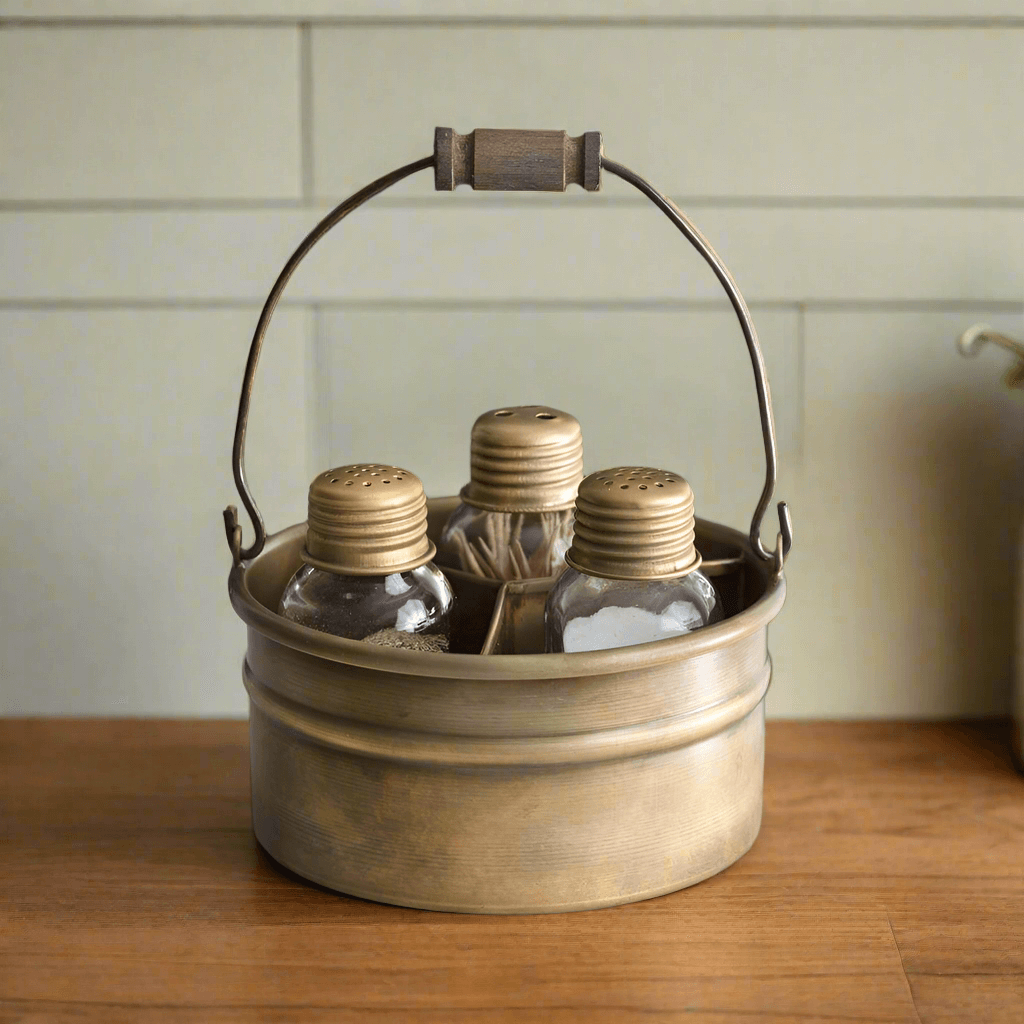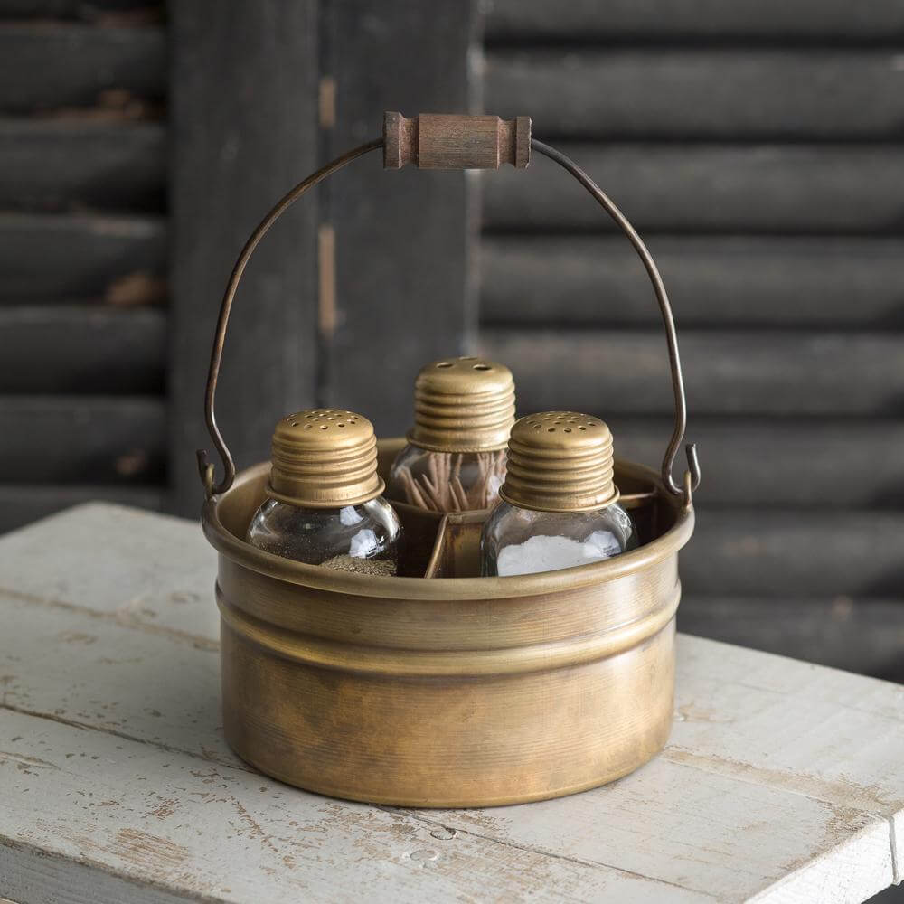 If you love that old world vibe, you might have fallen for our vintage inspired antique brass kitchen caddy. The round kitchen organizer has a wooden handle, and makes for a charming salt and pepper storage solution, that will sit swimmingly on your farmhouse kitchen or dining table. To add to the antique charm, the shakers resemble small Mason jars.