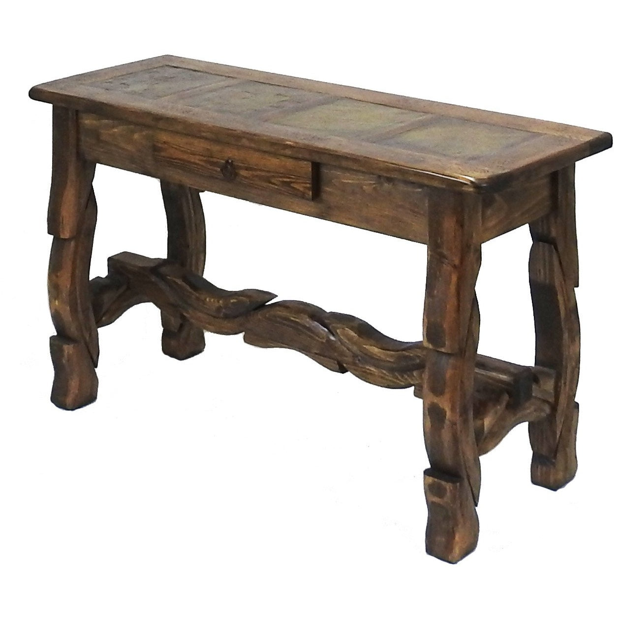 The Yugo Sofa Table stands out with its striking slate and wood surface, offering a durable and visually appealing area for displaying decorative items, photographs, or lamps. The table’s legs are adorned with intricate Yugo carvings, adding a distinctive touch of craftsmanship and Western flair.